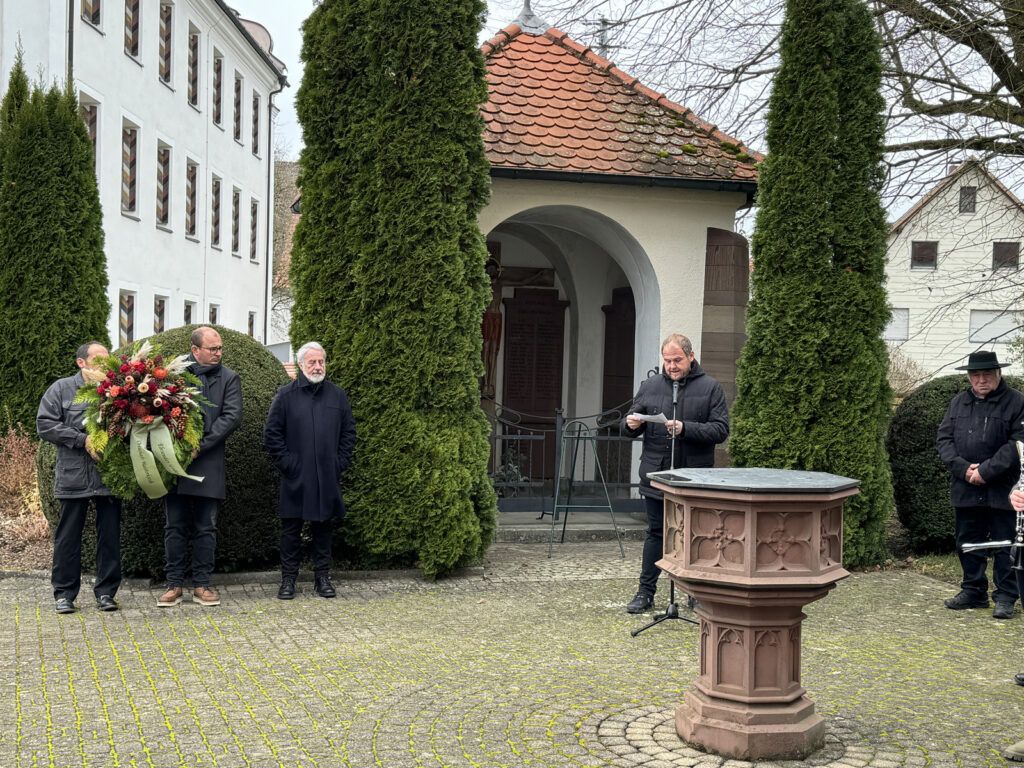 Überwiegend ältere Menschen wohnten der öffentlichen Gedenkfeier im Rahmen des staatlich angeordneten Volkstrauertags bei. Vor dem Klostergebäude wehte die Flagge in den Bundesfarben auf Halbmast. Vor der Opfer-Gedenkstätte hatte die Musikkapelle Haisterkirch ihren gewohnten Platz eingenommen.
