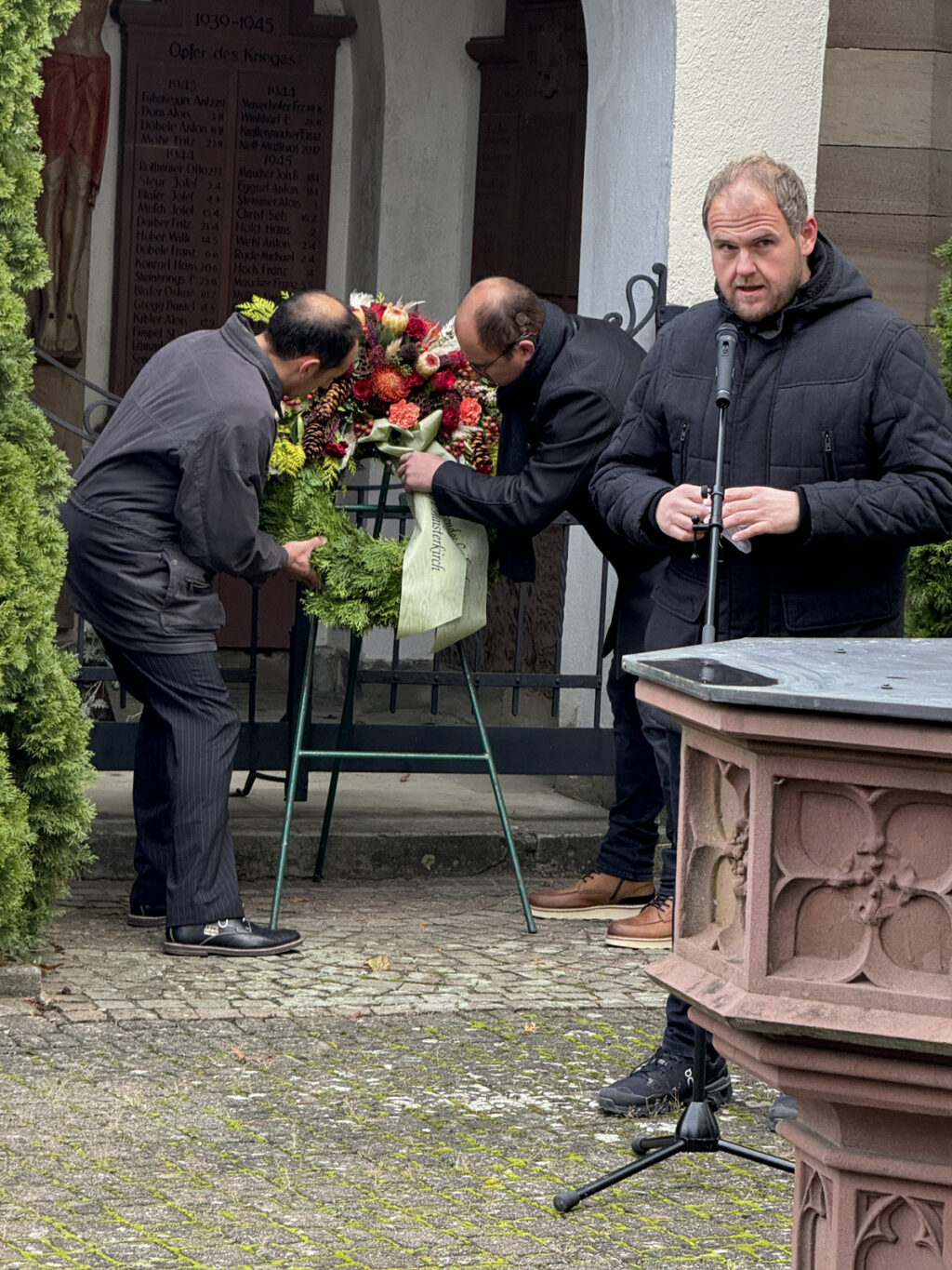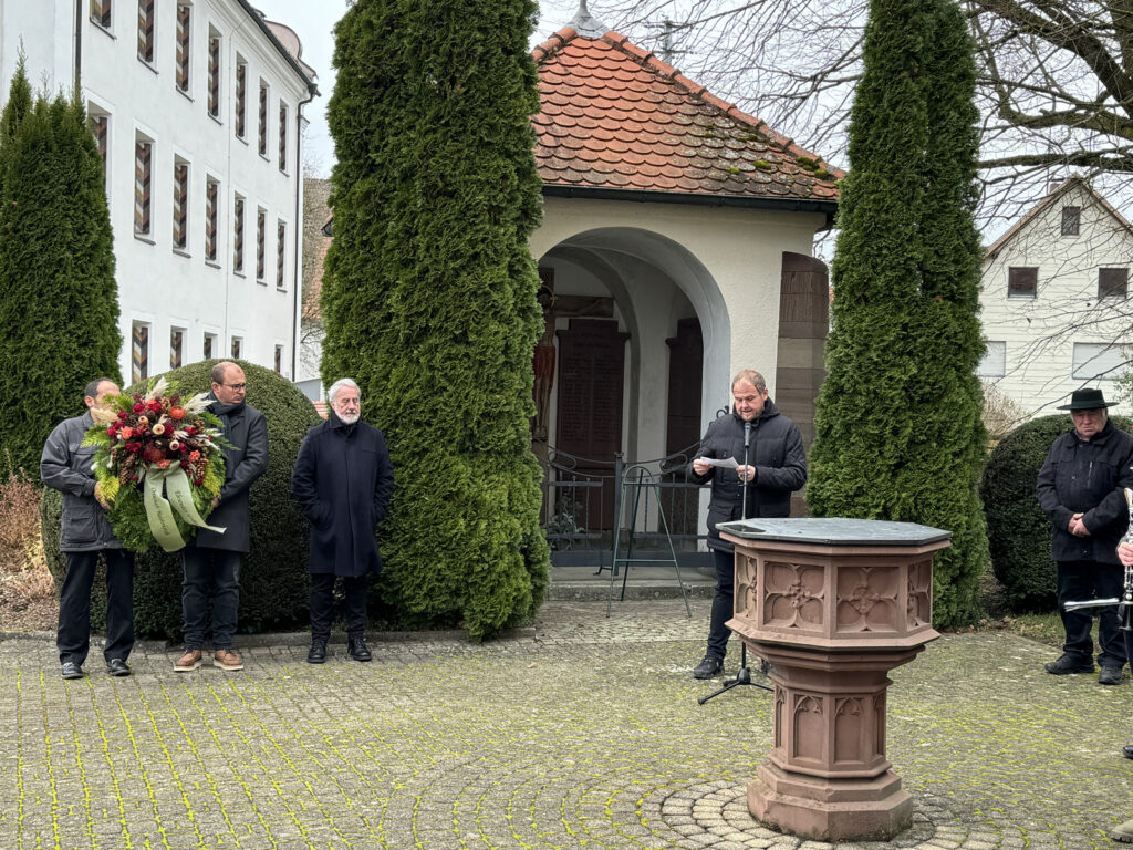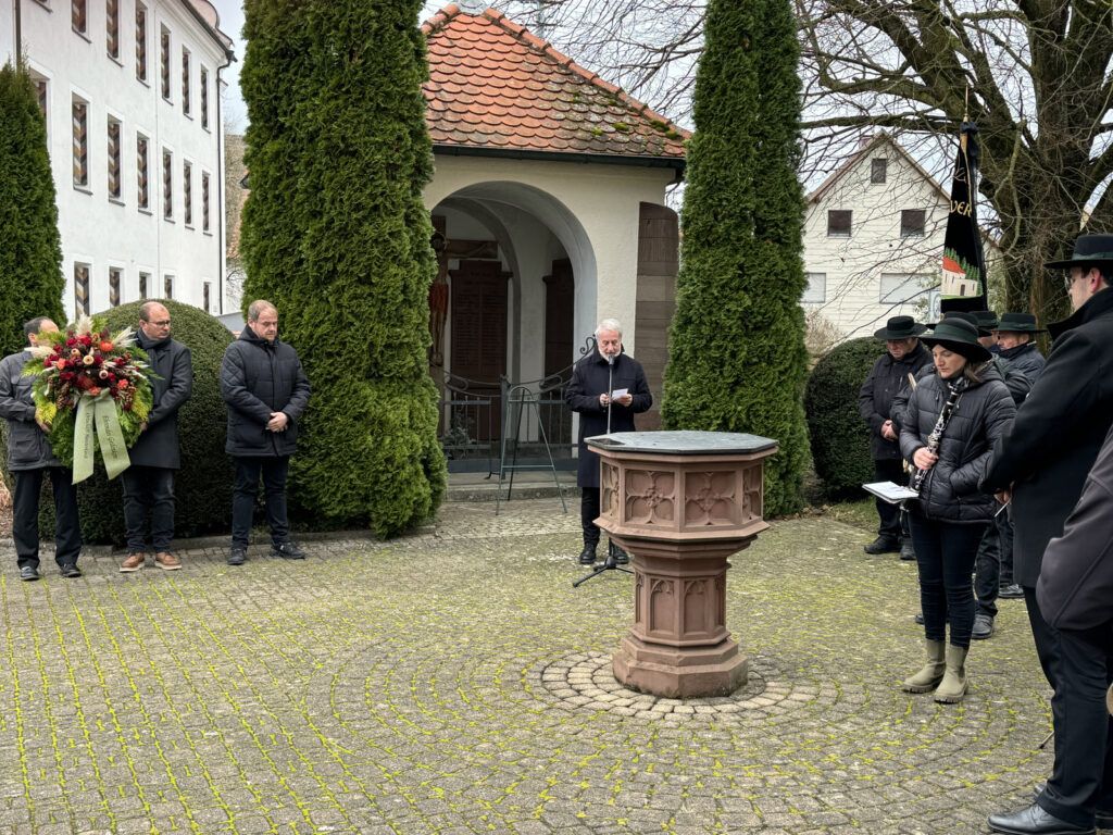 Haisterkirch – Recht kühl und windig war es am Sonntagmorgen (17.11.) auf dem Vorplatz der Kirche St. Johannes Baptist in Haisterkirch. Hier hatten sich Mitbürgerinnen und Mitbürger eingefunden nach dem sonntäglichen Gottesdienst, den Pfarrer Ulrich Steck, Prior des Klosters Reute, zelebriert hatte.
