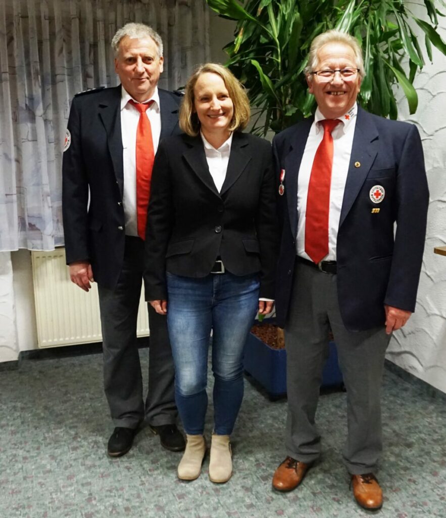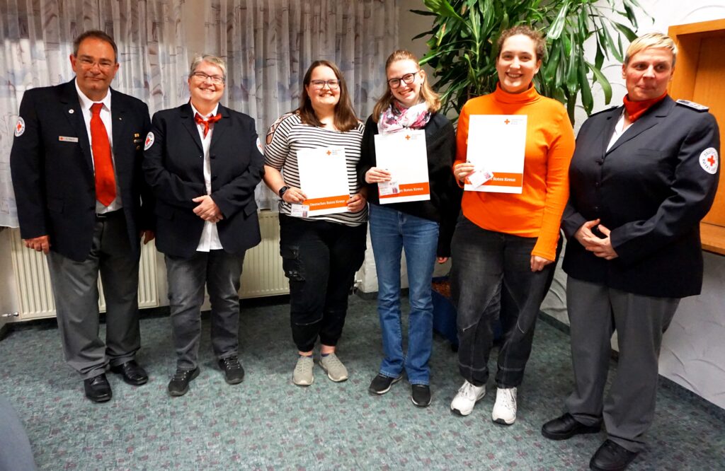 Unser Bild zeigt die Bereitschaftsleiter Burkhard Wendt und Ingrid Wendt BL mit den drei neu Verpflichteten Katharina Fesseler, Ciara Haller und Anna Muzlija; rechts Sandra Woserau, stellvertretende Bereitschaftsleiterin. Fotos: DRK-Ortsverband