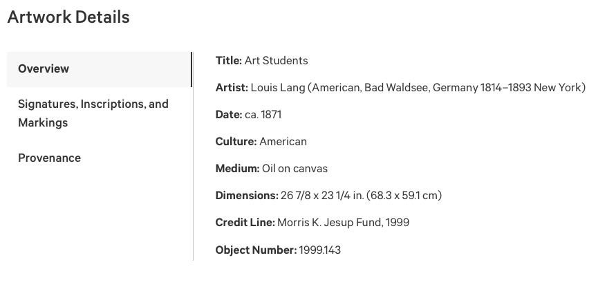 Louis Lang: Kunststudenten (ca. 1871). Dieses Werk wird derzeit im Metropolitan Museum of Arts in New York ausgestellt.