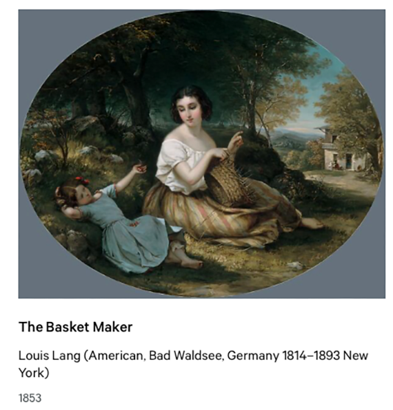 Dieses Werk von Louis Lang stammt von 1853. Es trägt den Titel „Die Korbmacherin” (The Basket Maker). Es ist wohl eines jener Lang-Werke, die im Magazin des New Yorker Museums verwahrt sind.