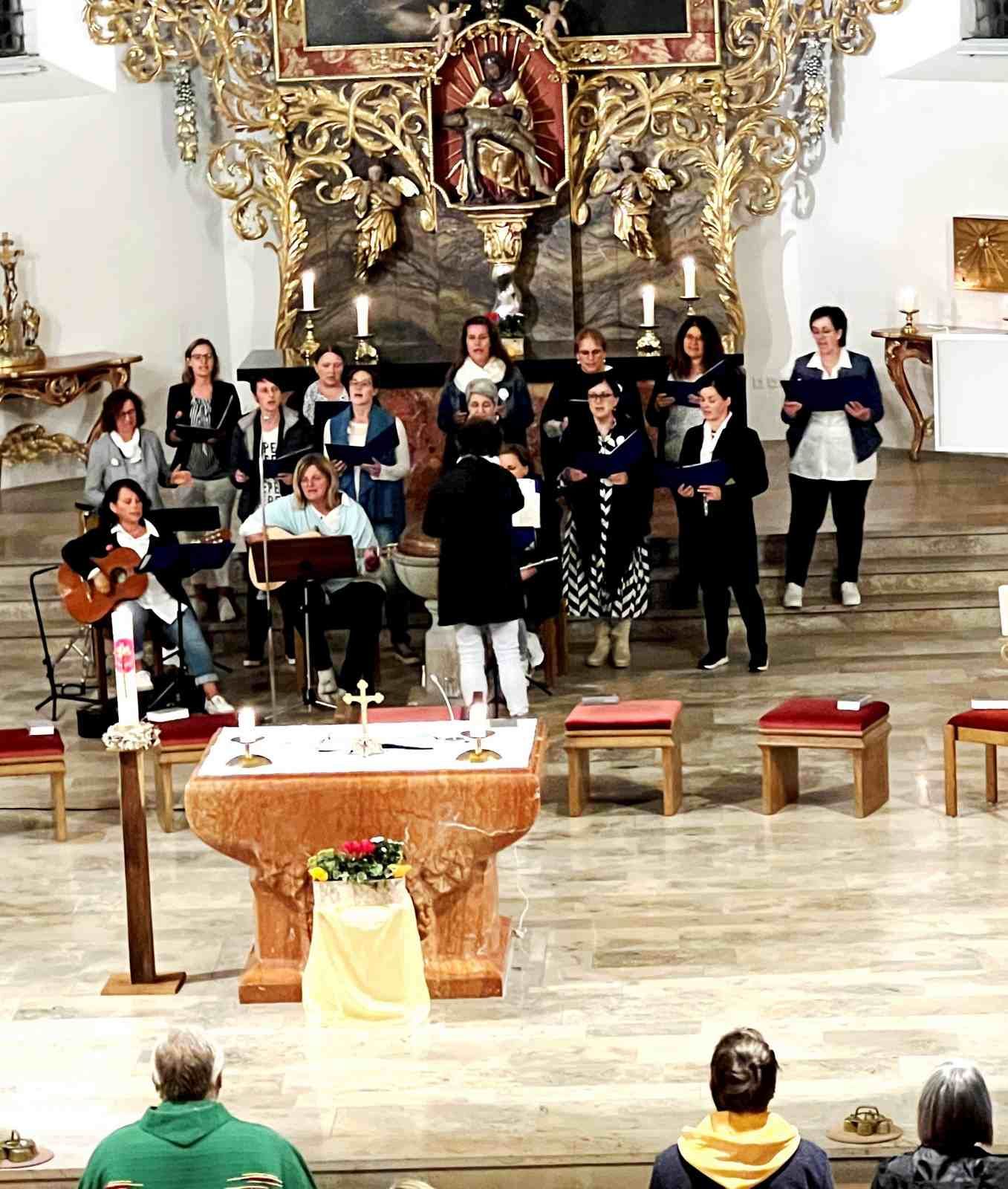 Die musikalische Gestaltung der Eucharistiefeier hatte wieder einmal die Gruppe „Aufbruch“ aus Eberhardzell übernommen. Die 15-köpfige Sängerinnengruppe dieses Frauenchors unter Leitung von Inge Mohr überzeugte gesanglich und auch instrumental mit ihrer einfühlsamen, ausdrucksstarken, auch zur Meditation anregenden Vortrags- und Spielweise. Auch begleitete die Gruppe den Gemeindegesang mit passend ausgewähltem Liedgut.