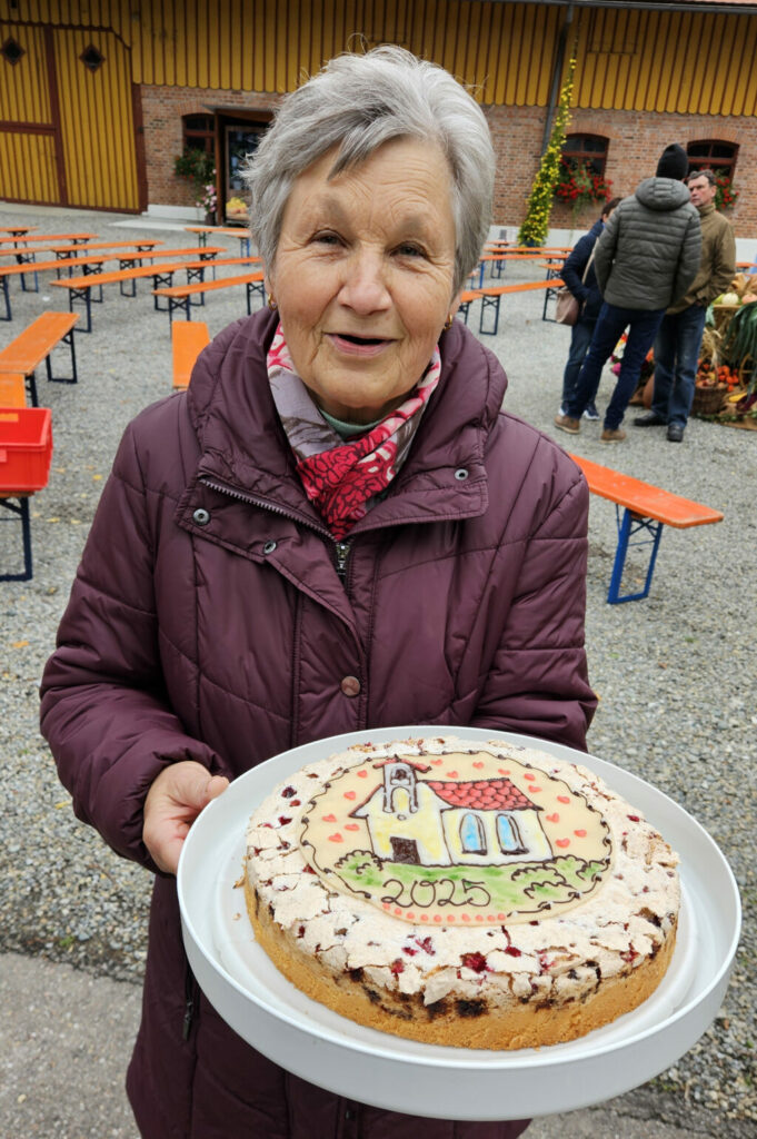 Mesnerin Gerda Schuhmacher mit dem Kuchen, der “ihre” Kapelle zeigt.