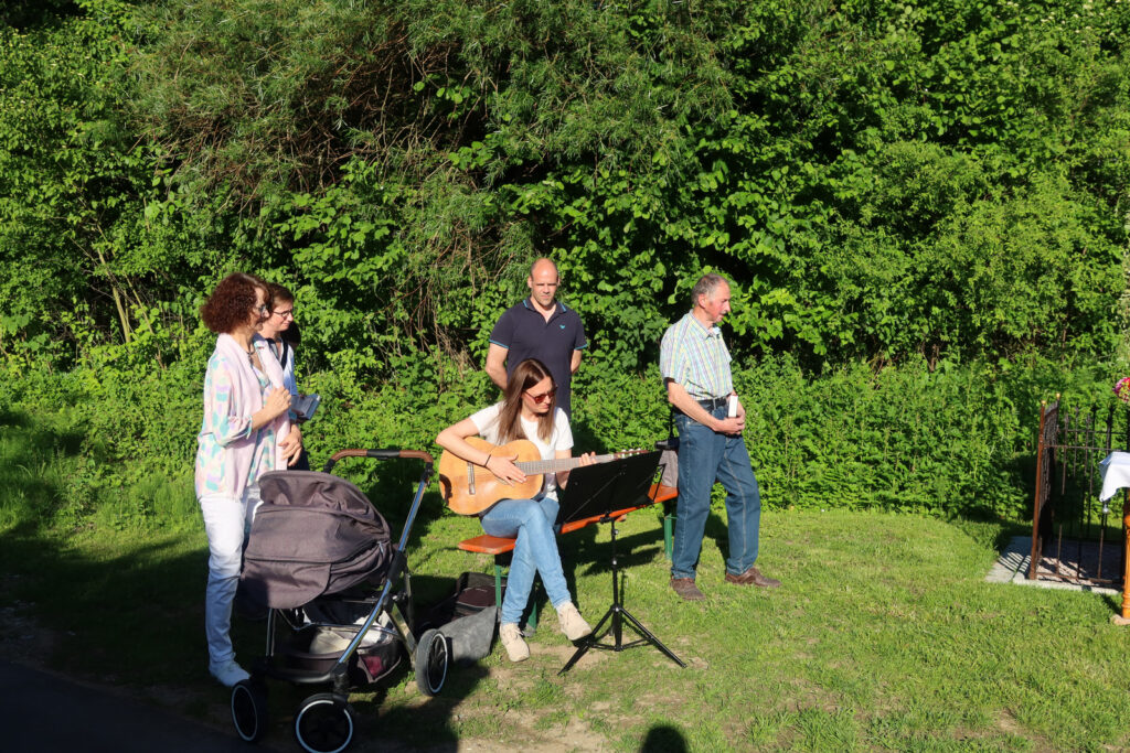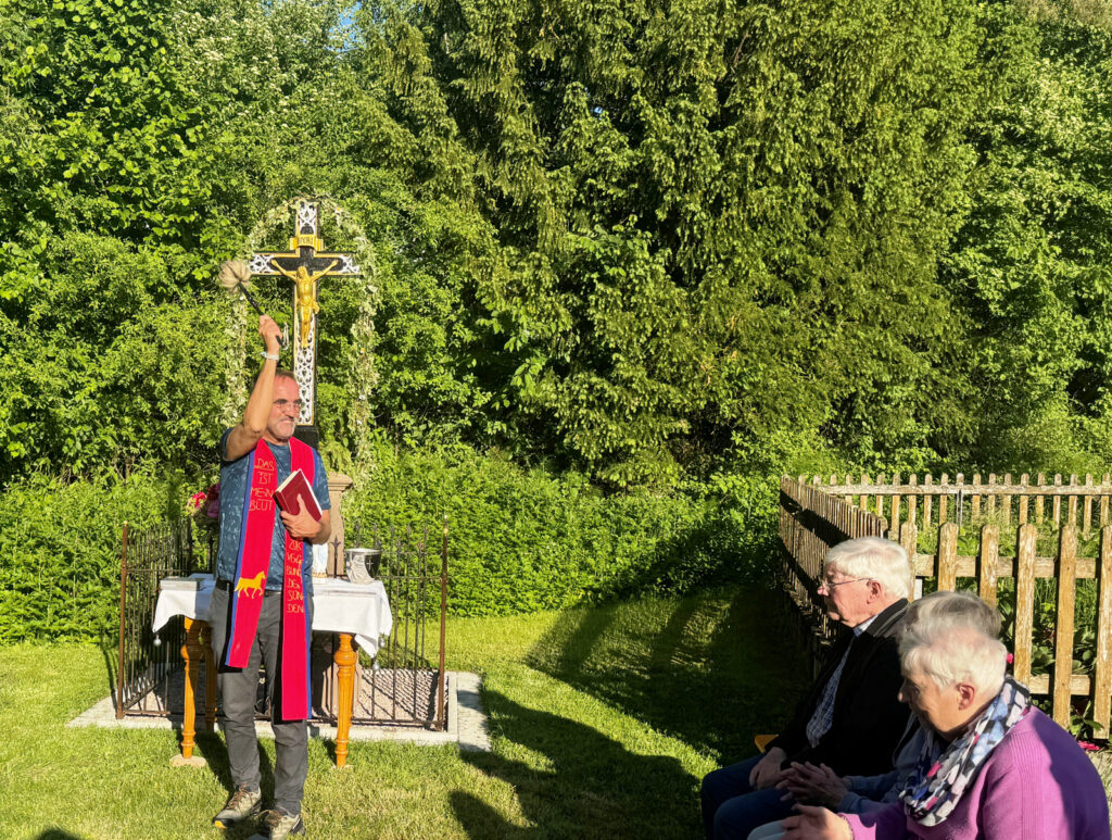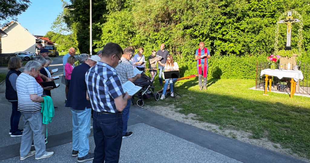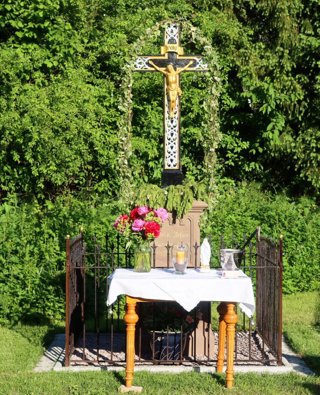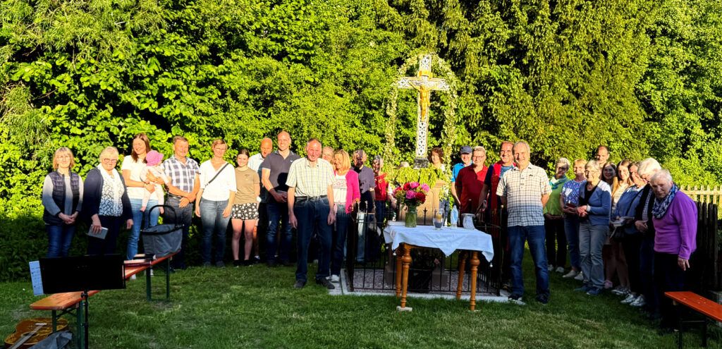 Auf dem zu seinem Bauernhof gehörenden Grundstück, direkt am Oberen Weg in Osterhofen gelegen, schenkte Franz Fimpel dem zwischenzeitlich von ihm restaurierten Kreuz einen gut einsichtbaren, neuen Standort. An diesem sommerlichen, letzten Freitagabend im Mai 2025 bestrahlte die Sonne mit voller Pracht das wunderschön geschmückte Kreuz und vor allem auch das glänzende, neu vergoldete Kruzifix. Zu der feierlichen Segnung waren vor allem Verwandte von Franz Fimpel, Nachbarn aus Hittelkofen und Osterhofen und etliche Haisterkircher Kirchengemeindemitglieder gekommen. Sie alle beteten und sangen auch Marienlieder , die von der früheren Nachbarin Marina an der Gitarre begleitet wurden. Im Anschluss an diese Kreuzsegnung trafen sich die Gekommenen zur geselligen Runde vor dem Haus Fimpel.