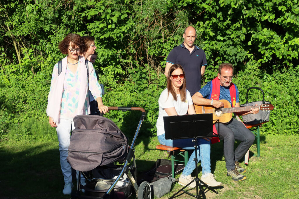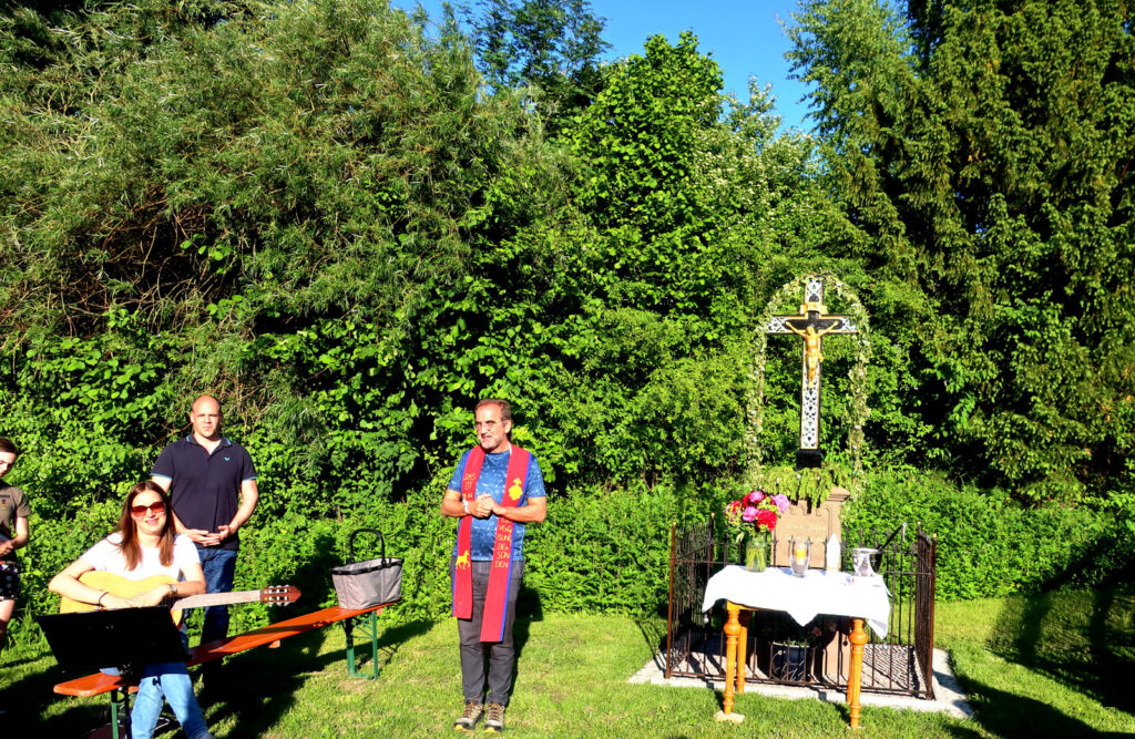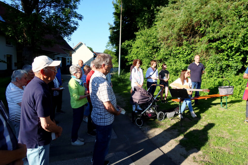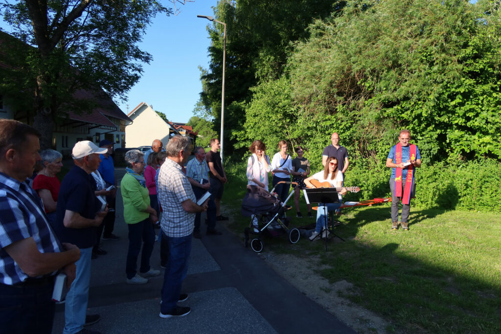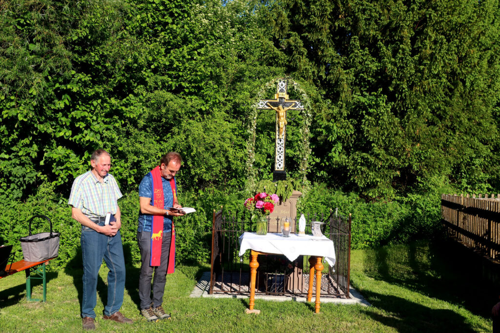 Auf dem zu seinem Bauernhof gehörenden Grundstück, direkt am Oberen Weg in Osterhofen gelegen, schenkte Franz Fimpel dem zwischenzeitlich von ihm restaurierten Kreuz einen gut einsichtbaren, neuen Standort. An diesem sommerlichen, letzten Freitagabend im Mai 2025 bestrahlte die Sonne mit voller Pracht das wunderschön geschmückte Kreuz und vor allem auch das glänzende, neu vergoldete Kruzifix. Zu der feierlichen Segnung waren vor allem Verwandte von Franz Fimpel, Nachbarn aus Hittelkofen und Osterhofen und etliche Haisterkircher Kirchengemeindemitglieder gekommen. Sie alle beteten und sangen auch Marienlieder , die von der früheren Nachbarin Marina an der Gitarre begleitet wurden. Im Anschluss an diese Kreuzsegnung trafen sich die Gekommenen zur geselligen Runde vor dem Haus Fimpel.