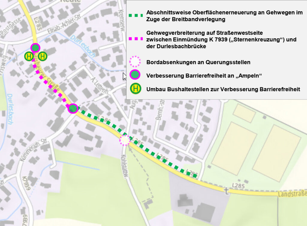 Bad Waldsee – Im Zuge der Brücken- und Straßenbaumaßnahmen an der L285 in Reute werden die beiden bestehenden Bushaltestellen umgebaut. Darüber hinaus wird in Reute der bestehende Gehweg auf der Straßenwestseite (Richtung Aulendorf blickend auf der linken Straßenseite) zwischen dem Gasthaus Stern und der Brücke über den Durlesbach verbreitert. Was konkret umgesetzt werden soll und die wesentlichen Hintergründe zu den Vorhaben werden im Folgenden erläutert.