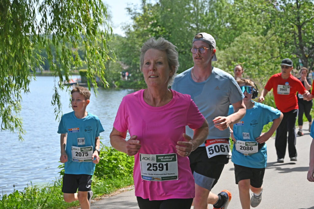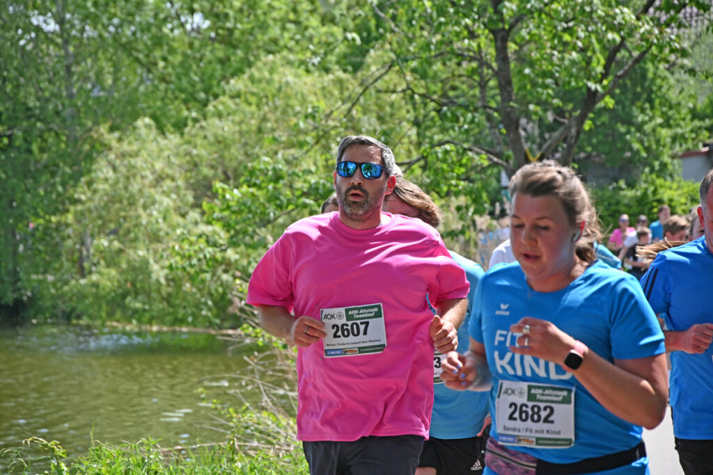 11.45 Uhr. Der Teamlauf startet. Jetzt wird’s bunt. Blaue, weiße, rosa, schwarze Leibchen laufen in Pulks durch die Stadt. Wer hatte am Schluss die meisten Runden auf seinem Konto? Beim Teamlauf geht es 42 Minuten lang durch die Innenstadt. Dabei geht es nicht um möglichst schnelle Zeiten, sondern um die im Team gelaufenen Runden. 42 Minuten haben die beliebig großen Teams Zeit, um ihre Runden durch die historische Innenstadt zu drehen. Bekannte Gesichter der Stadt konnte man auf der Strecke entdecken: Monika Ludy und Markus Mohr, im Hauptberuf für die städtischen Finanzen zuständig, und Christoph Liebmann, Fachbereichsleiter Zentrales, waren auf der Strecke. Mit solchen Ausdauersportlern im Team ist die Stadtverwaltung um ihren OB gut aufgestellt. Auch Pfarrer Stefan Werner sah man unter den Laufsportlern.