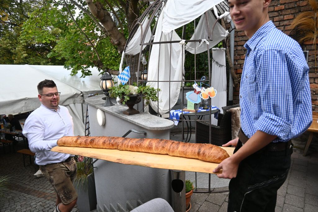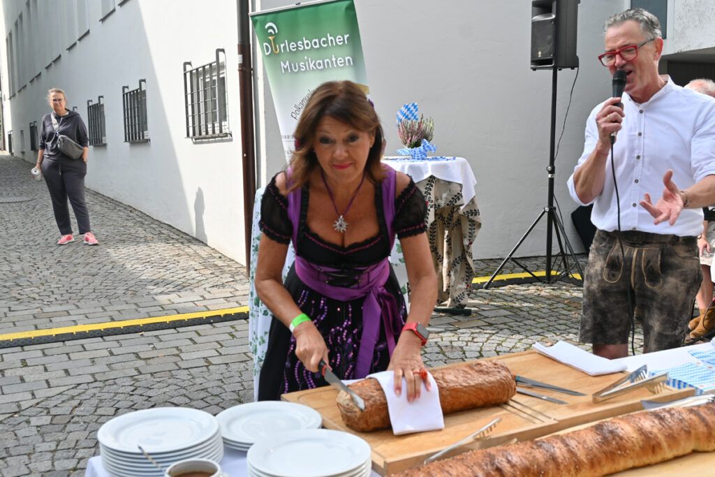 Berthold Schmidinger heißt seine Gäste herzlich willkommen. Klar, OB Matthias Henne und Bürgermeisterin Ludy sind ebenfalls da. Sie kommen für einen guten Zweck. Ein Riesenseele und der dazu passende Leberkäselaib sollen angeschnitten und der Erlös der verzehrten Portionen zum Ankauf von IPads für die Bad Waldseer Schulen verwendet werden.