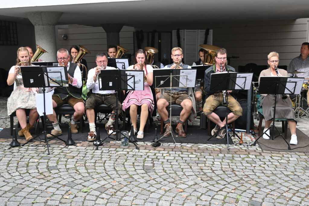 Die ersten Gäste kommen. Die „Durlesbacher Musikanten“ beziehen kurz vor halb elf ihre Plätze gegenüber dem Zelt. Die Instrumente werden angestimmt. Und schon geht’s los mit zünftiger Frühschoppenmusik.