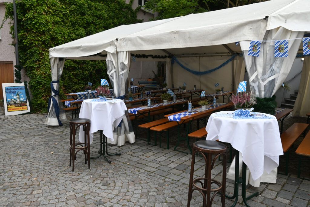 Ein Andenkenstand mit Lebkuchenherzen und Postkarten. Eine Hüpfburg für Kinder. Der Ausschankwagen steht auch parat. Hier wird dann das echte Augustiner-Wies‘nbier gezapft. Und das ist nicht von schlechten Eltern. Hat es doch mit sechs „Umdrehungen“ ein paar Prozentpunkte mehr als der normale Gerstensaft.