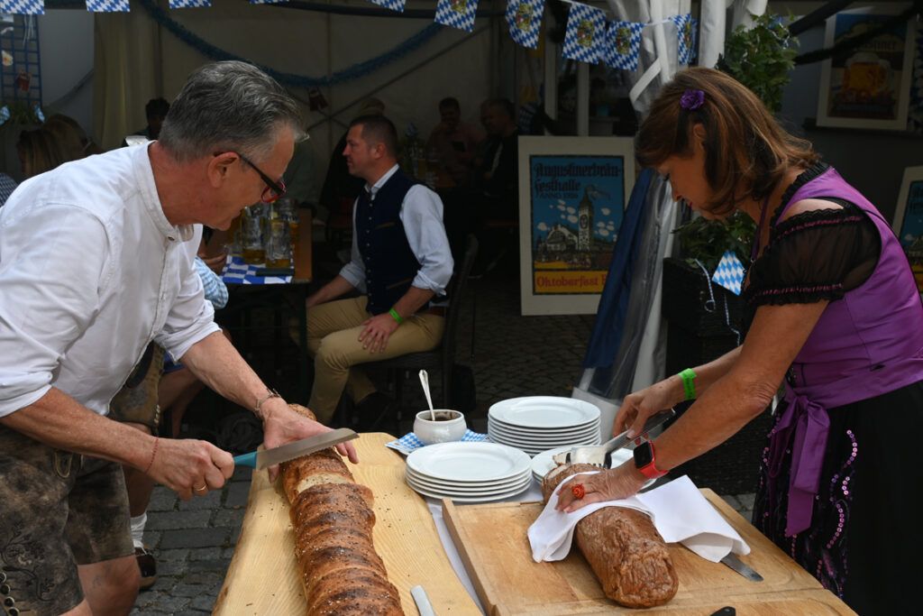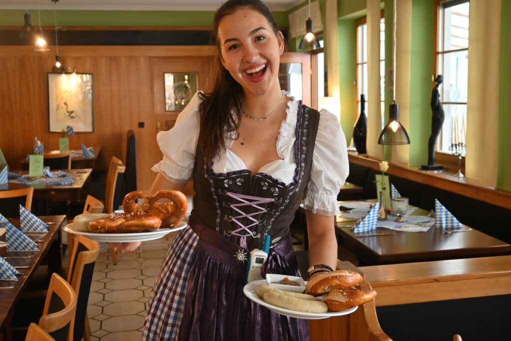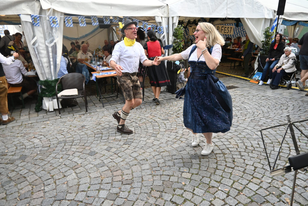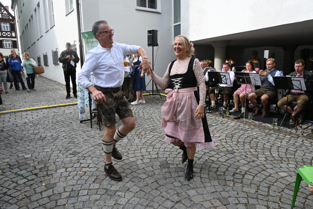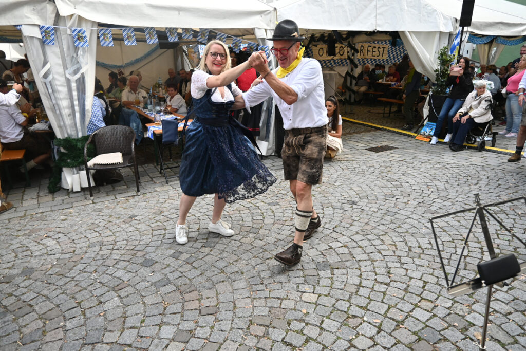 Bad Waldsee – Morgens um halb neun am vergangenen Samstag (30.9.) eilt ein geschäftiger Berthold Schmidinger, Hotelier und Wirt vom „Grünen Baum“, durch die „Wies‘nzone“ in der Wettgasse, gibt letzte Anweisungen. Frisch vom Friseur, mit einem kleinen Blumengesteck im Haar, kommt Siggi Schmidinger, Chefin und Herz von Hotel und Gaststätte, mit strahlender Laune auf den Festplatz: „Jetzt muss ich bloß noch mein Dirndl anziehen, dann kann es los gehen.“