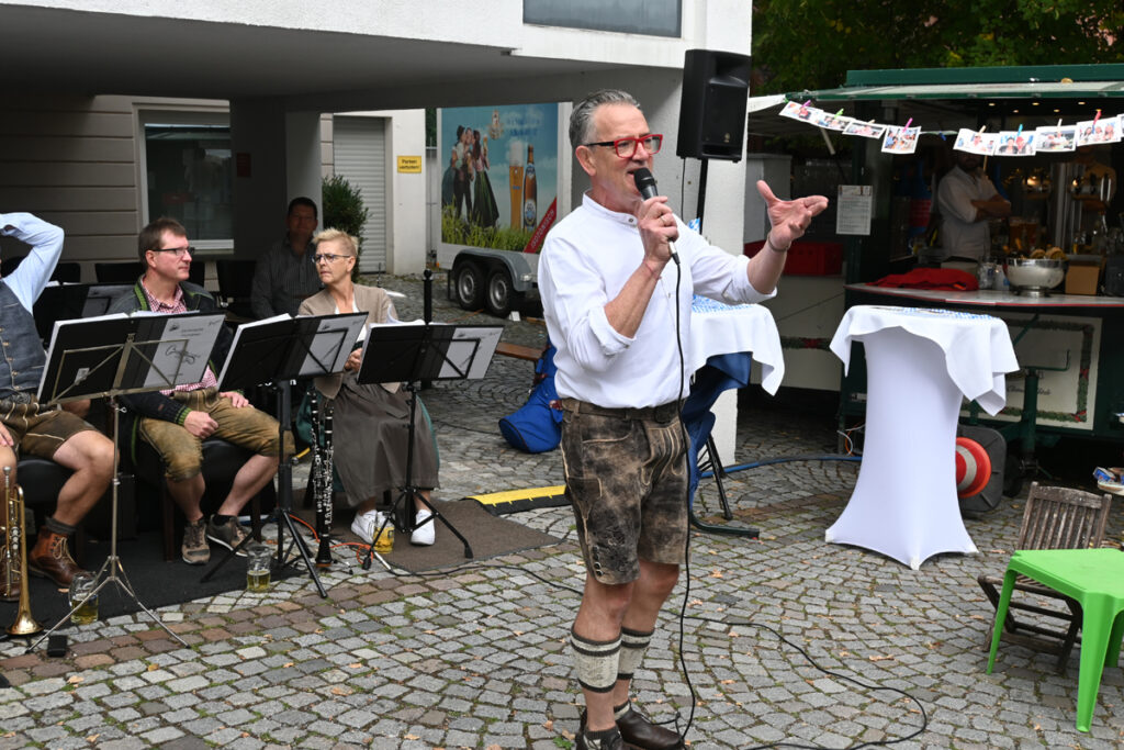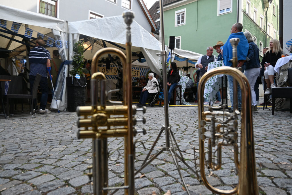 Die ersten Gäste kommen. Die „Durlesbacher Musikanten“ beziehen kurz vor halb elf ihre Plätze gegenüber dem Zelt. Die Instrumente werden angestimmt. Und schon geht’s los mit zünftiger Frühschoppenmusik.