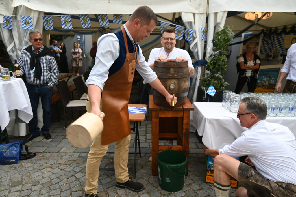 Das Fass für den Anstich wird vorbereitet. Kernig und echt aus Holz. Rustikale Fassdauben, von starken Eisenbändern gehalten. Sieht so aus, als könnte dieses Fass viele Geschichten von vielen fröhlichen Festen erzählen.