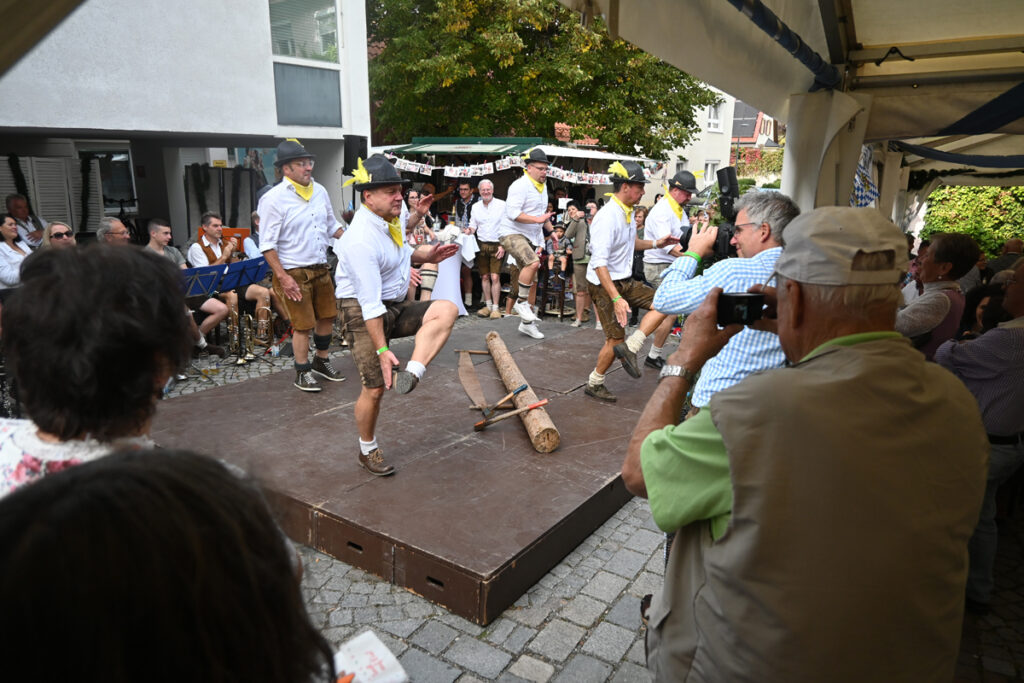 Um halb vier dann ein Höhepunkt der bayrischen Folklore. Die „Baum“-Plattler-Buaba, angeführt von Berthe Schmidinger und seinen „Buaba“ Felix und Niklas. Mottogerecht mit Filzhut, weißem Hemd, kurzen Lederhosen, Wadlstrümpfen und Haferlschuhen ausstaffiert, legten sie zur Melodie „Mir san die lustigen Holzhacker-Buam“ einen echten, kernigen Schuhplattler aufs Parkett. Die sechs „gstandenen Mannsbilder“ klopften sich auf die belederten Schenkel, ließen die Handflächen auf die Schuhsolen klatschen, drehten sich im Kreis und hackten und sägten noch einen ganzen Baumsstamm auseinander. Dafür gab`s jede Menge Applaus.