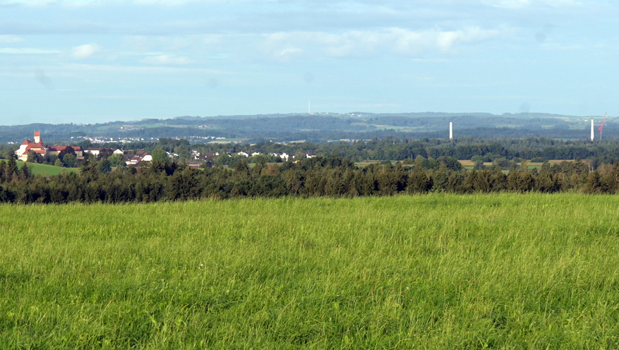 Blick von Bad Waldsee mit dem Teleobjektiv auf die entstehenden Windkraftanlagen im Röschenwald bei Aulendorf. Links im Bild zum Vergleich Kloster Reute, Mitte im Hintergrund der Funkmast auf dem Höchsten, rechts zwei der geplanten vier Türme. Foto: Erwin Linder