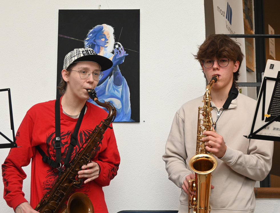 Von der Jugendmusikschule waren Jessica Kloos mit einem Tenorsaxophon und Aaron Schumacher mit einem Altsaxophon am Start und unterhielten das Vernissage-Publikum mit jazzigen Melodien.