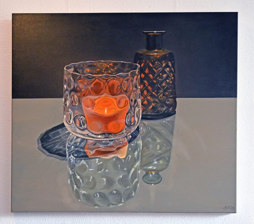 Weiter aus dem Ausstellungsflyer: „Zu versuchen, selbst einem schlichten Gegenstand oder gar einem zerbrochnen Glas, ein Stück Schönheit abzugewinnen und es auf die Leinwand zu bannen, ist für die Künstlerin Freude und Herausforderung zugleich.“