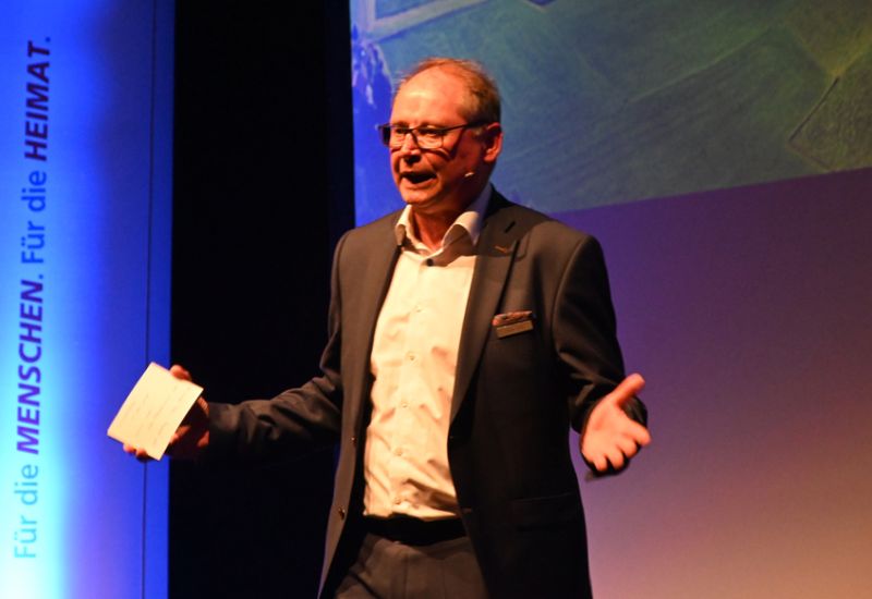 Josef Hodrus ging ans Rednerpult. Jetzt erfuhren die Mitglieder, warum Anton Sproll nicht durchs Forum führte. Er verlässt die VBAO zum Jahresende. Hodrus würdigte Sprolls Verdienste um die Bank als Prokurist, als Vorstand und in der neuen Konstellation als Regionaldirektor. „Anton, du bist das Gesicht der Bank. Bei deinen Kunden und deinen Mitarbeitern. Und wenn es dir mal langweilig wird im Ruhestand, wir finden immer einen Job für dich.“