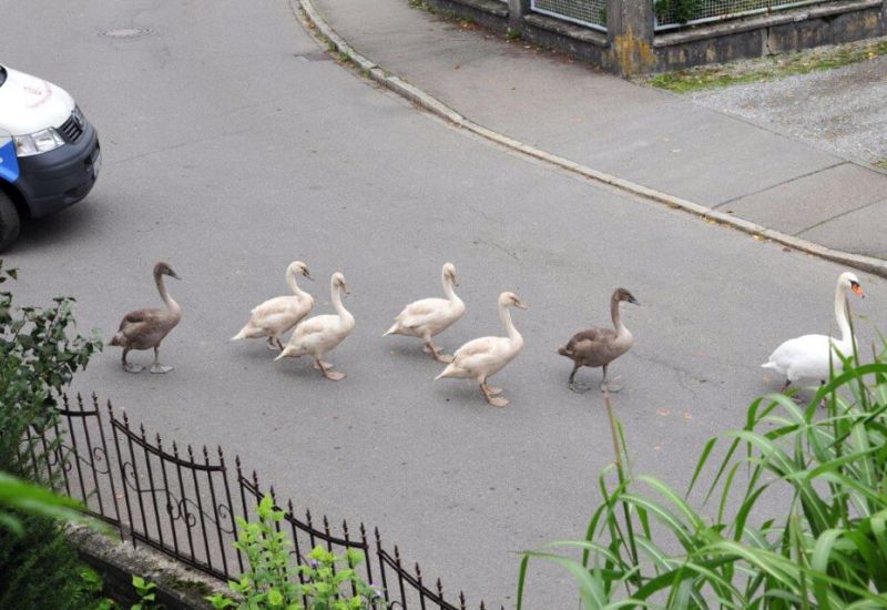 Nach einem Landausflug kehren Schwäne zurück zum Bad Waldseer Stadtsee. Gesehen von Anita Pinggera in Steinach am 30. Januar.