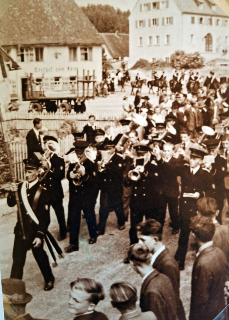 Für die Dreharbeiten zum Film „Der Reiter vom Heiligen Blut“ im Jahre 1949 rückte eigens der Musikverein mit Fahne und klingendem Spiel aus. Im Hintergrund der „Adler“ und das nicht mehr vorhandene Gemeindehaus, ein aus der früheren „Adler“-Brauerei hervorgegangenes NS-Dorfgemeinschaftshaus. (rei)