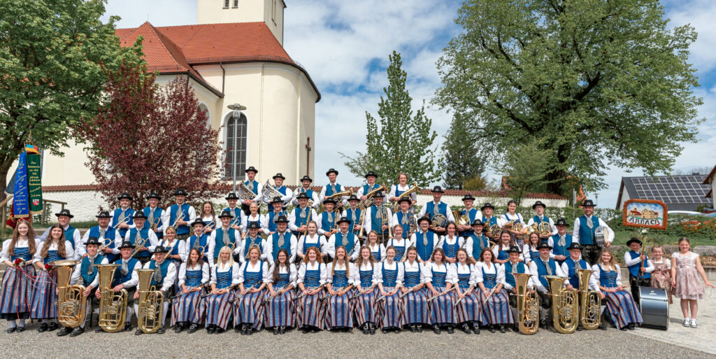 Der Musikverein Arnach im Jahre 2024. Der älteste aktive Musikant ist der Trompeter Franz Xaver („Xare“) Miller, geboren 1935. Er steht in der dritten Reihe (Zweiter von links). MVA-Archiv