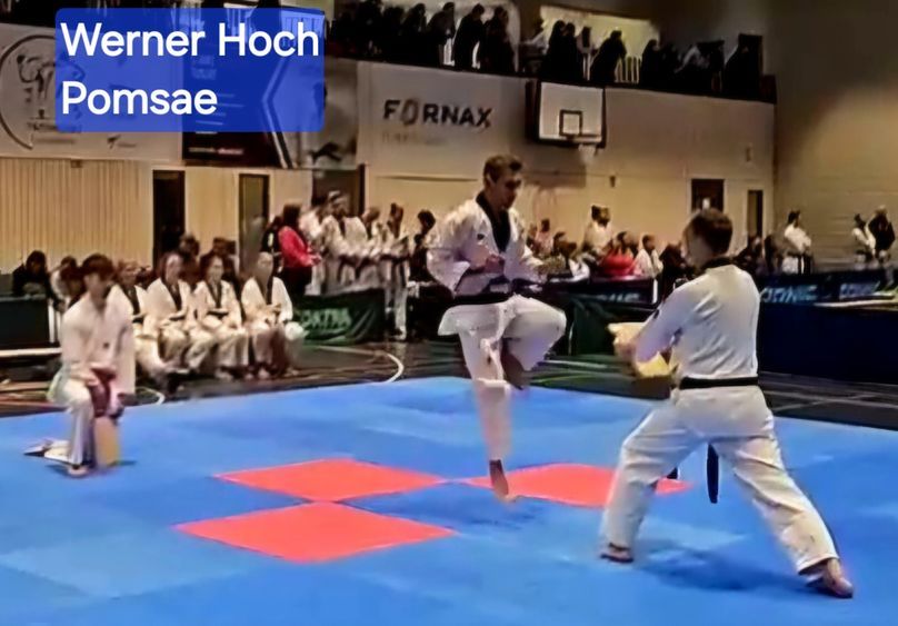 Werner Hoch setzte besondere Akzente mit zusätzlichen Bruchtests aus der Poomsae, mit perfektem Timing, präziser Technik und kontrollierter Kraft demonstrierte er die Anwendung der Techniken aus der Form heraus und hinterließ ebenfalls Eindruck bei den Prüfern.