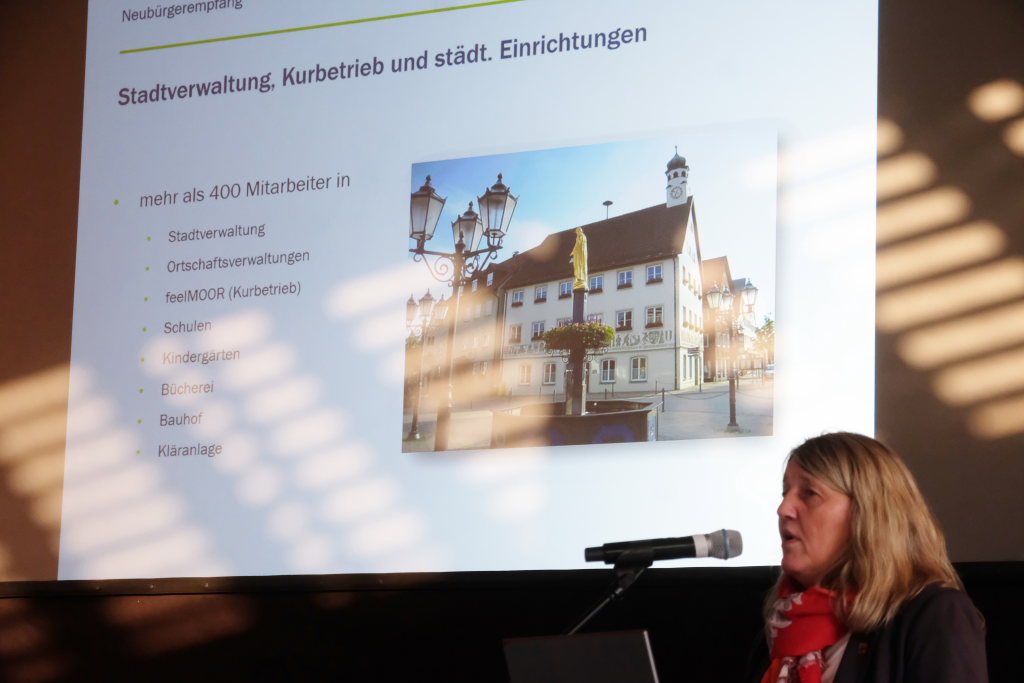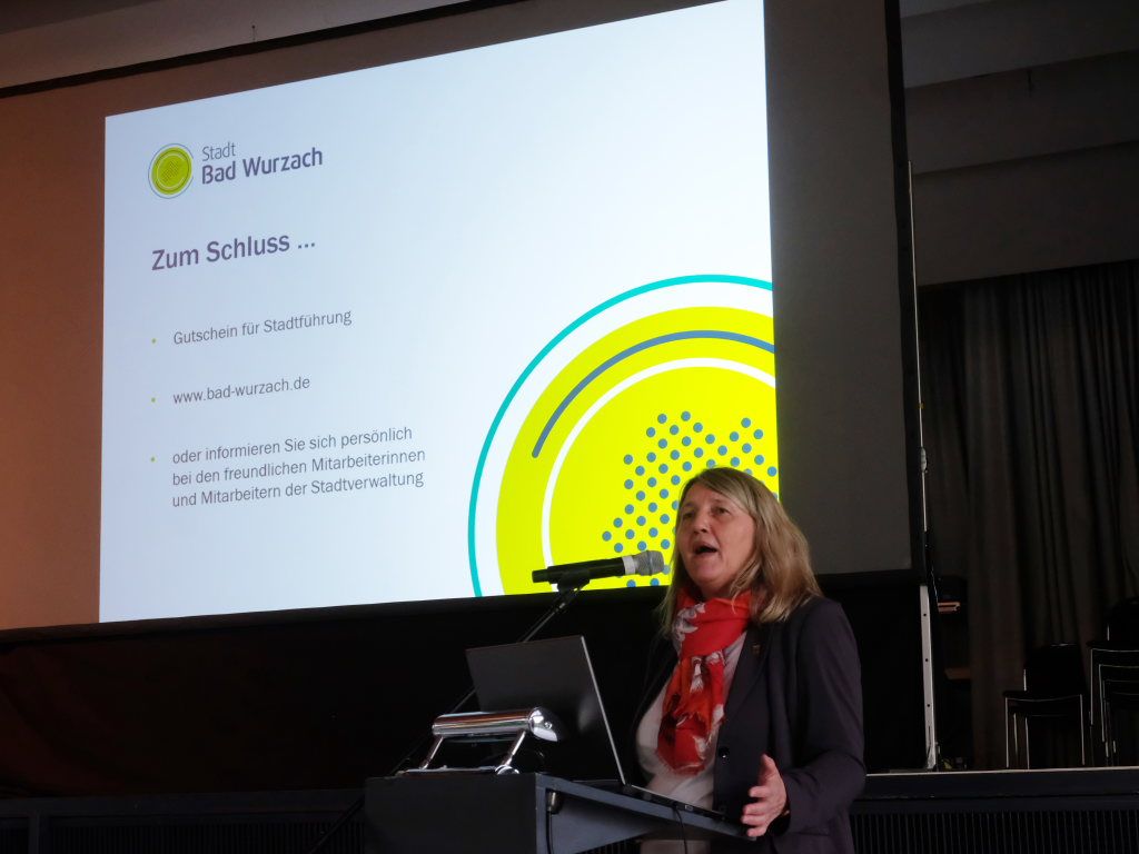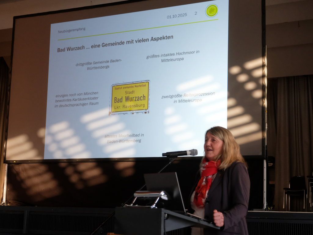Bürgermeisterin Alexandra Scherer freute sich in ihrer Begrüßung, dass so viele neue Bürger der Stadt der Einladung gefolgt waren, ehe sie in ihren Vortrag einstieg. Bad Wurzach sei eine Gemeinde mit vielen Aspekten: Die 182 Quadratkilometer der drittgrößten Flächengemeinde Baden-Württembergs bestehen zu 45 Quadratkilometer aus Wald, 103 Quadratkilometer werden landwirtschaftlich genutzt. Das Gemeindegebiet umfasst eine Fläche, die größer als das Fürstentum Lichtenstein ist. Leider habe man nicht dessen Finanzkraft. Neben dem Kernort gehören noch neun Ortschaften und insgesamt 234 Weiler und Wohnplätze zur Gemarkung Bad Wurzach. Bad Wurzach ist das älteste Moorheilbad Baden-Württembergs und trägt seit 1950 den Titel Bad. Es besitzt mit dem Wurzacher Ried ein mit dem Europa-Diplom ausgezeichnetes Naturschutzgebiet und kann mit dem Heilig-Blut-Fest die zweitgrößte Reiterprozession Mitteleuropas bieten.