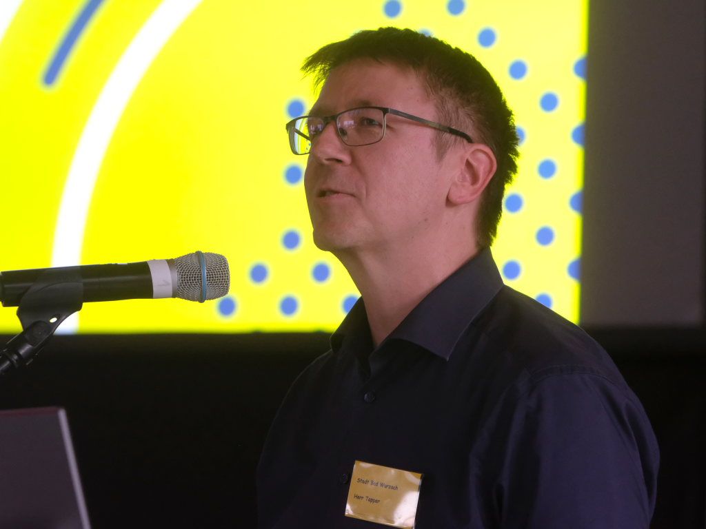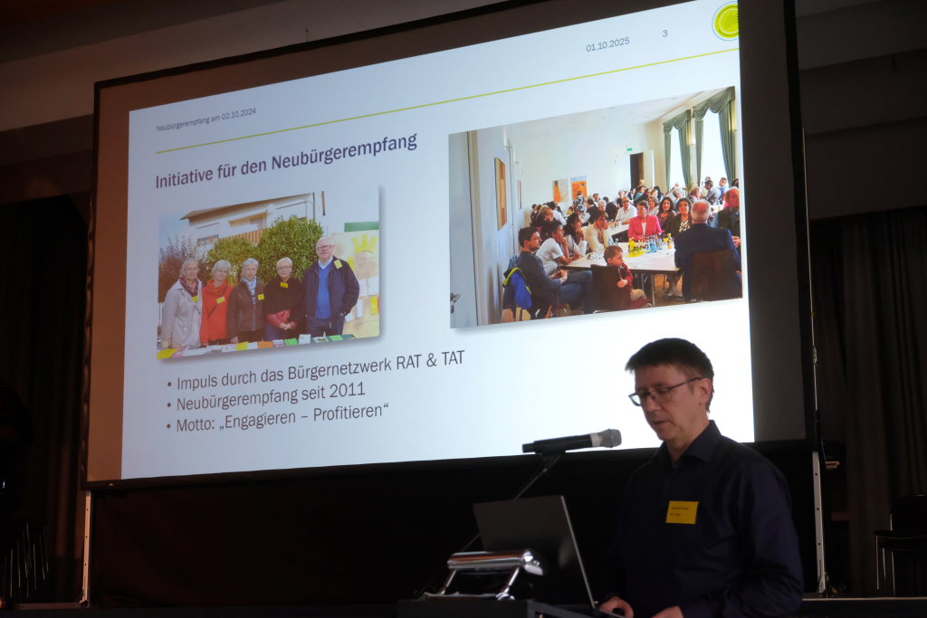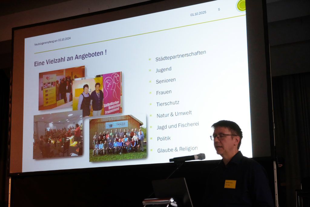 Martin Tapper – bei der Stadtverwaltung u.a. für Presse- und Öffentlichkeitsarbeit zuständig – gab danach einen kurzen Abriss über das Vereinswesen in der Stadt und den Teilgemeinden. Neben zahlreichen Sportvereinen gibt es in fast jeder Gemeinde einen Blasmusikverein, dazu einen Posaunenchor der evangelischen Kirche, aber auch viele Chöre (kirchlich wie weltlich) die sich über Verstärkung freuen würden. In jeder Gemeinde gibt es eine Feuerwehrabteilung, beim Feuerwehrhaus in der Stadt wird der Feuerwehrnachwuchs ausgebildet. Neben den verschiedenen Ortsvereinen von Hilfsdiensten wie DRK, JRK und DLRG gibt es zahlreiche weitere Vereine mit sozialer Ausrichtung: Den Krankenpflegeverein, Altenpflegeverein, eine Hospizgruppe, die Betreiber des Tafelladens, Herz und Gemüt oder Treffpunkt Asyl. Freunde des Bauerntheaters kommen in Arnach, Hauerz und Ziegelbach auf ihre Kosten. Insgesamt sieben Narrenzünfte pflegen in der fünften Jahreszeit das Fasnetsbrauchtum. Der Partnerschaftsverein pflegt die Verbindungen zu den einzelnen Partnerstädten. Im ökumenischen Miteinander arbeiten die vier christlichen Gemeinden zusammen: Bei Gottesdiensten, Friedensgebeten, Essen für alle und beim Kleiderladen Jacke-wie Hose arbeiten sie harmonisch zusammen. „Ich lade sie ein, deren Angebote anzunehmen,“ schloss Martin Tapper seinen Vortrag.