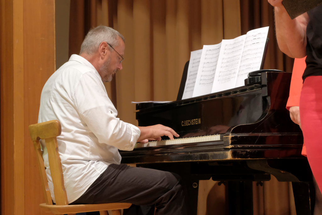 Für richtig „Stimmung“ sorgte Güner Musch mit seinem Witz zu Beginn des zweiten Konzertteiles mit dem Frauenchor des Ziegelbacher Kirchenchores: Dass Frauen für den einfachen Vorgang des Geldabhebens am Automaten fünfmal so viele Aktionen benötigen wie ein Mann brachte den weiblichen Teil des Publikums etwas in Wallung