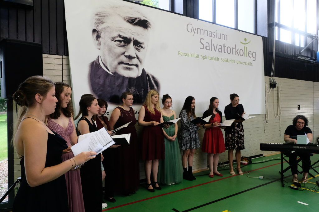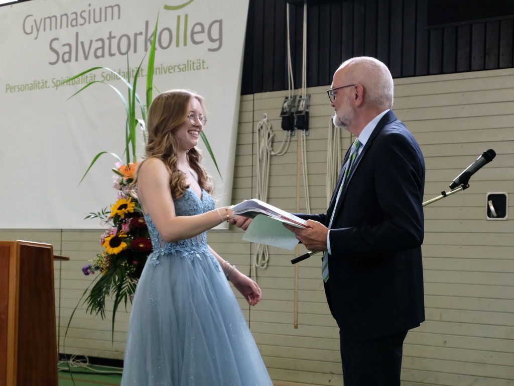 Schülervertreterin Martha Lemanczyk verarbeitete ihre und die Erfahrungen ihre Mit-Abiturient/innen während der letzten acht Jahre am Salvatorkolleg teilweise im Fußballjargon, zumal parallel zu der Feier das EM-Viertelfinale Deutschland gegen Spanien lief. Die erste Halbzeit ihres Schullebens hätten sie in der Grundschule verbracht, die zweite in der Unter- und Mittelstufe des Salvatorkollegs, die Oberstufe, mit welcher der Ernst des Lebens für sie begonnen habe, die Nachspielzeit und das Finale.