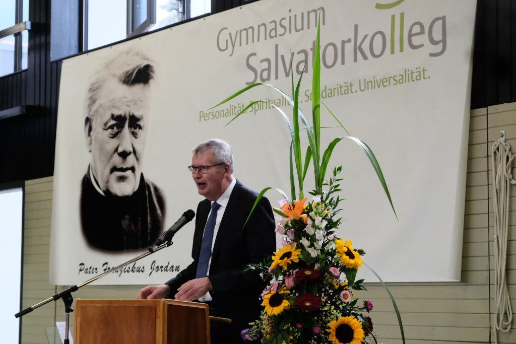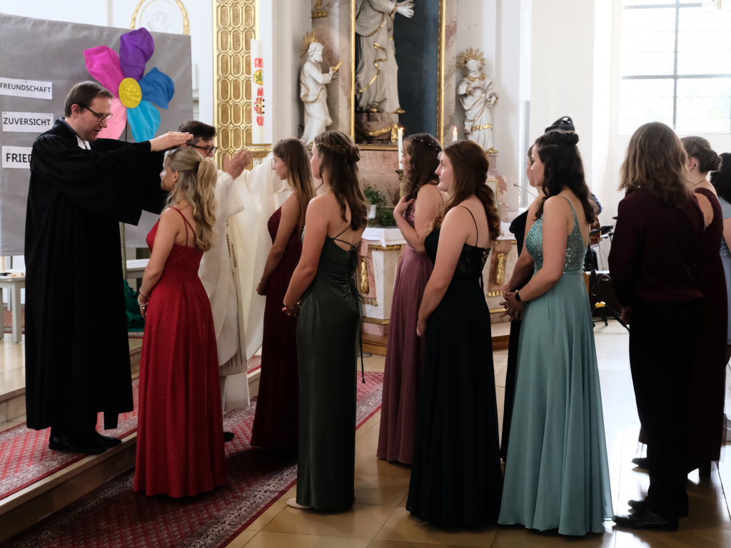 Eine intensive Entwicklungszeit liege hinter, aber auch noch vor den Abiturienten. „Faszinierend bei euch jungen Leuten finde ich immer den Blick für wichtige Werte und Ideale: für Gerechtigkeit und Fairness in der Schule, aber auch in der Gesellschaft gegenüber Benachteiligten, für einen guten Umgang mit der Natur bzw. Schöpfung, für Kultur und Zusammenleben – ich denke an diejenigen, die sich in Vereinen, Musikkapellen, Kirchengemeinden oder hier an der Schule in der KSJ oder SMV engagieren.“ Die Zeit der Jugend sei eine Zeit, in der Fragen nach einem guten, idealen Zusammenleben und nach der Zukunft sehr wichtig sind. „Ich glaube, es täte unserer Gesellschaft gut, wenn Euer Blick auf die Welt, Euer kritische und hoffnungsvolle Blick auf das Geschehen in der Welt so klar bleiben würde.“