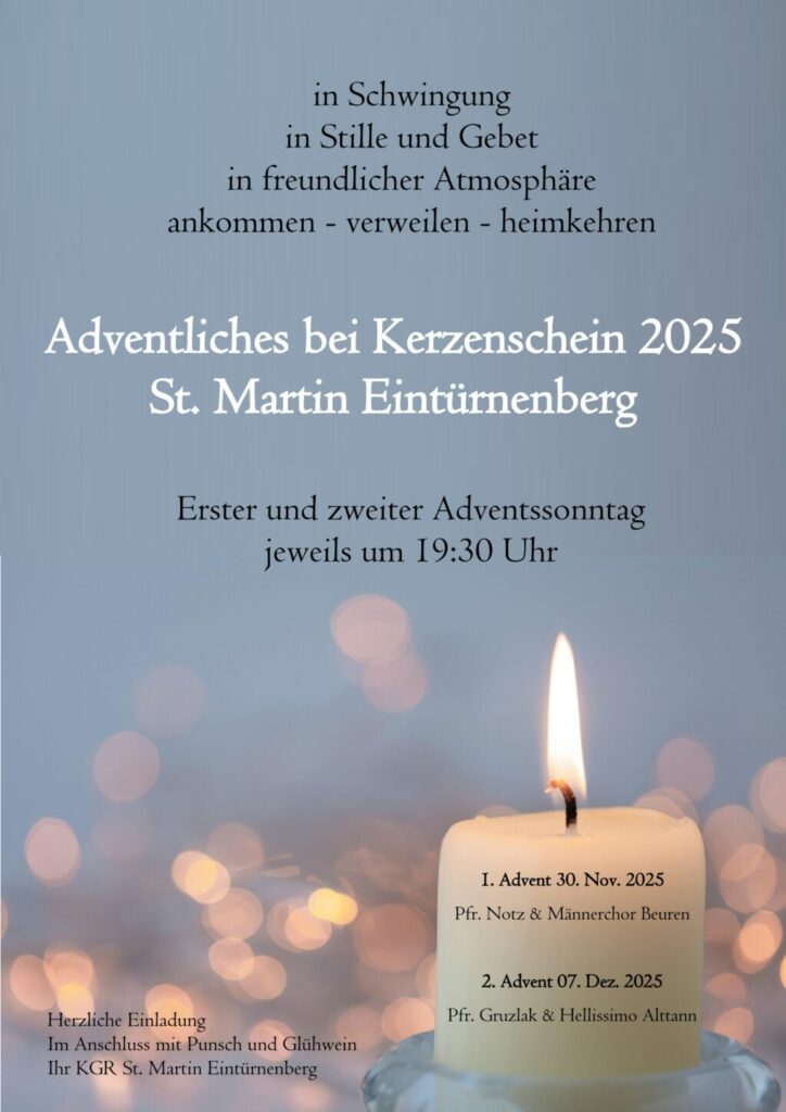 Eintürnenberg – Die Adventszeit beginnt – eine Zeit der Stille, des Gebets und der Begegnung. Wir laden herzlich ein, gemeinsam bei Kerzenschein in der Kirche St. Martin Eintürnenberg innezuhalten und adventliche Atmosphäre zu erleben: am 2. Adventssonntag um 19.30 Uhr.