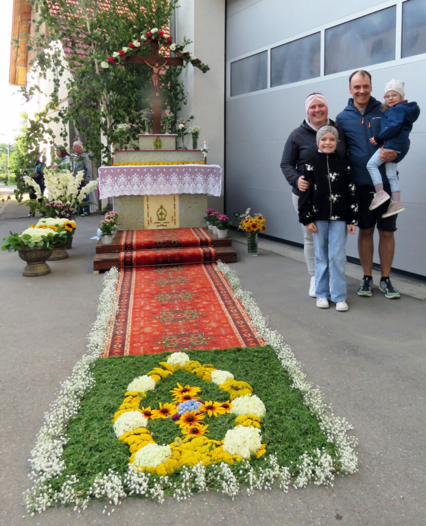 Mindestens seit den 1950er-Jahren hat die Familie Mangler-Mönig den Truschwender Altar beim Heiligblutfest aufgebaut und geschmückt. Anton Mangler ist vor wenigen Jahren gestorben, seine Witwe Erika kann es altershalber nicht mehr „machen“. Jetzt ist die Familie von Walter und Marina Feurle in die Bresche gesprungen und hat die ehrenvolle, aber auch mühevolle Aufgabe übernommen, unterstützt von Toni Mangler. Er und seine Mutter Erika waren heuer auf die Ehrentribüne am Rathaus eingeladen – zum Dank für die jahrzehntelange ehrenamtliche Betreuung des Truschwender Altars, der bei der Reiterprozession die dritte Station ist (nach Schloss und Josenhof, vor Reinstein).