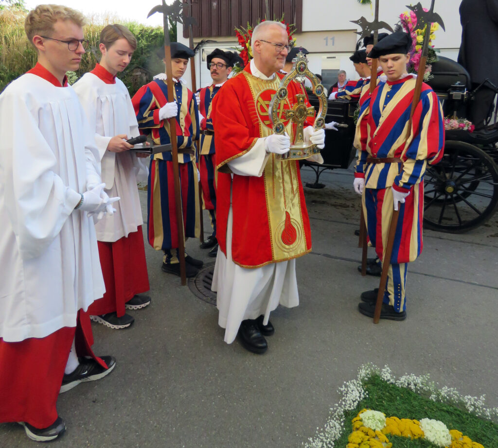 Pfarrer Maier hält das Reliquiar in Händen und betritt den Blumenteppich.