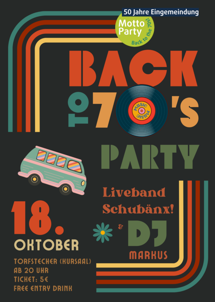 Damit für die Mottoparty „Back to the 70’s“ am 18. Oktober für alle etwas Musikalisches dabei ist, wird zunächst DJ Markus den jüngeren Besucher einheizen. Danach wird für gut zwei Stunden die Band “Schubänx” spielen, ehe noch einmal DJ Markus das musikalische Zepter bis zum Schluss übernimmt.