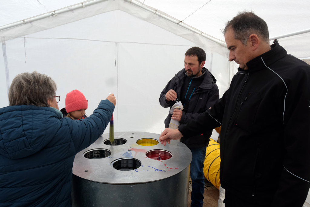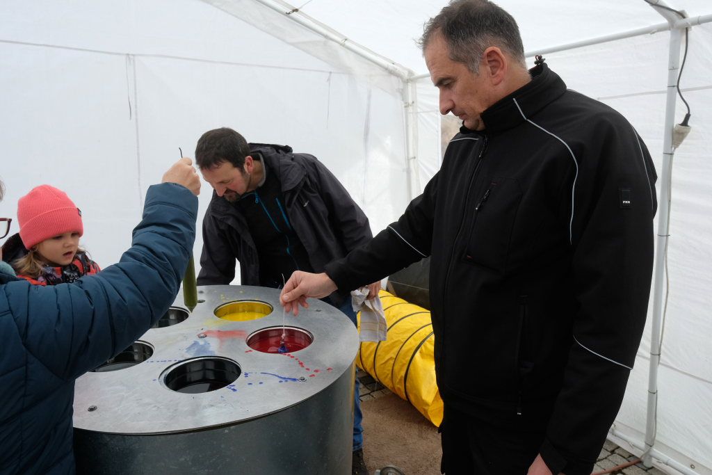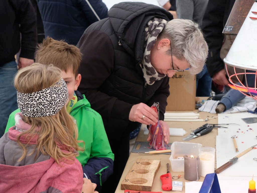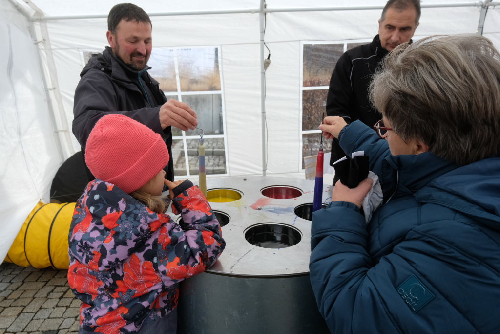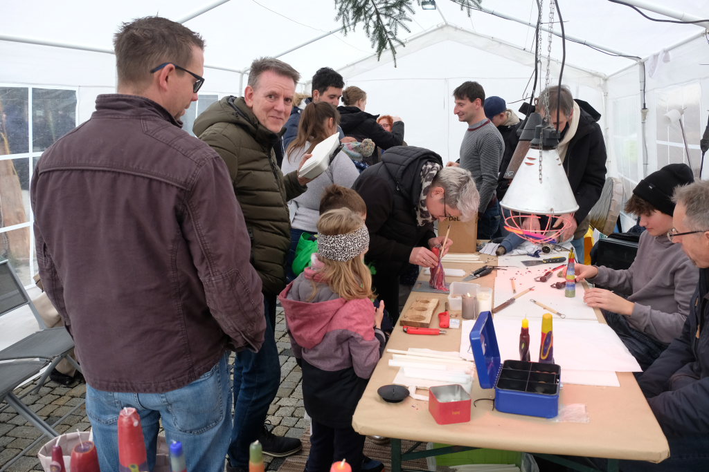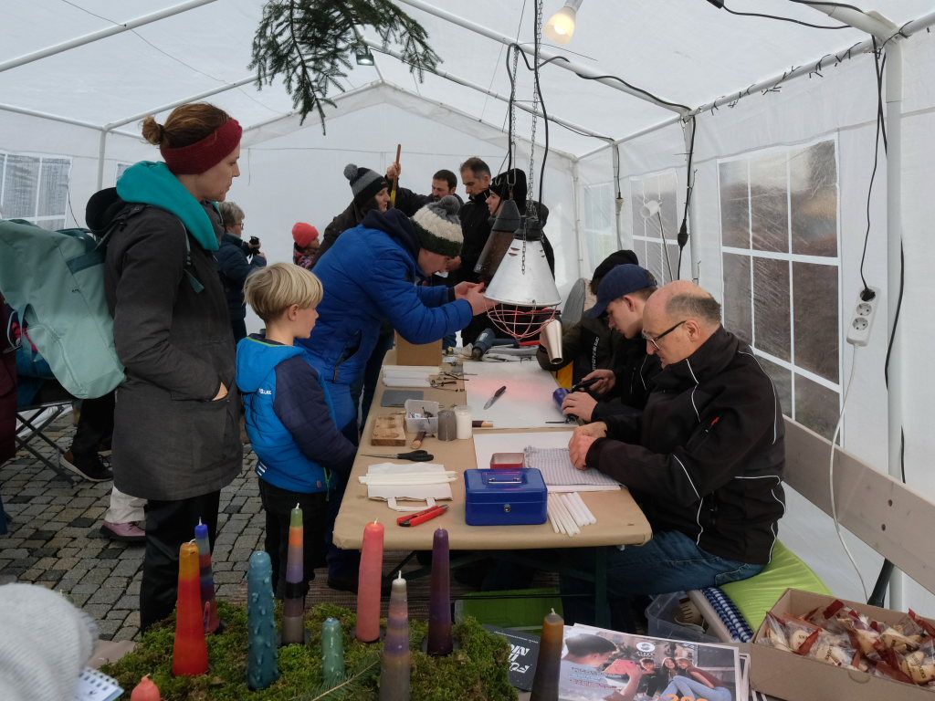 Ein großer Spaß für jung und alt war im kuschelig warmen Zelt vor dem Eingang zur Bad Wurzach Info das Kerzenziehen. Dabei entstand ein generationenübergreifend ein regelrechter Wettkampf, wer denn nun die kunstvollste Kerze geschaffen hat. Und das mit durchaus sehenswerten Resultaten.