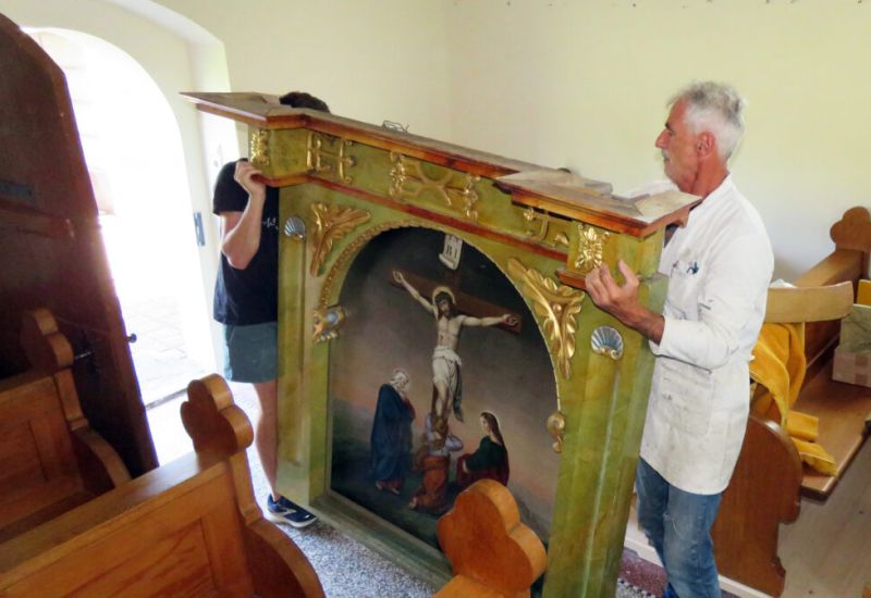 Bis 1984 also wusste man, dass der Altar in der Zeit vor 1752 in die Kapelle gekommen war, aber man wusste kein genaues Jahr. Bei der Renovation 1984 war der Altar weggerückt worden und Franz Reischmann, der vor 40 Jahren zusammen mit den Nachbarn eine große Innen- und Außenrenovation bewerkstelligte, sah eine Jahreszahl mit Inschrift: “1722” und “Dr. Rom”. Leider hat er damals nicht fotografiert. In seinem schriftlichen zweiseitigen Renovationsbericht hat er aber diese wichtige Beobachtung notiert. Das Foto von Inschrift und Jahreszahl haben wir jetzt, 40 Jahre später, nachgeholt. Es wird beim Lichtbildvortrag am Sonntag, 18. August, im Gemeindehaus in Arnach gezeigt (20.00 Uhr).