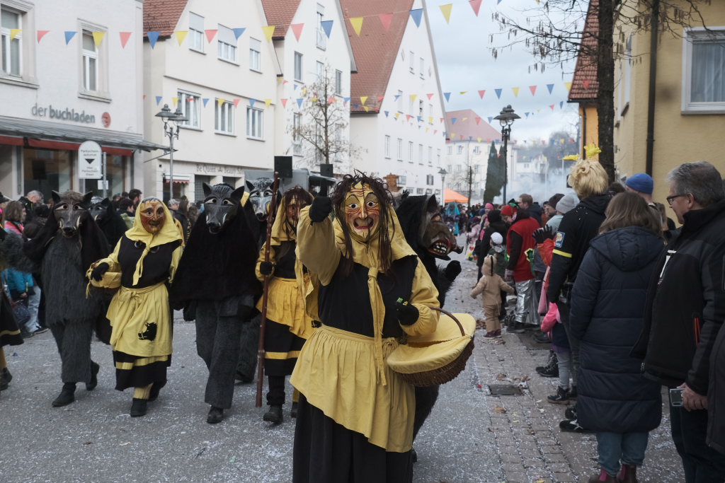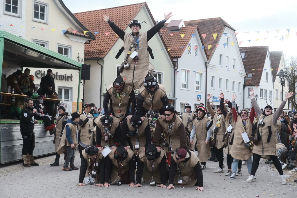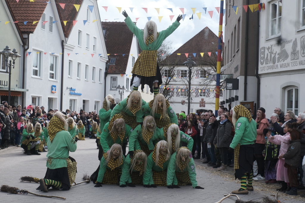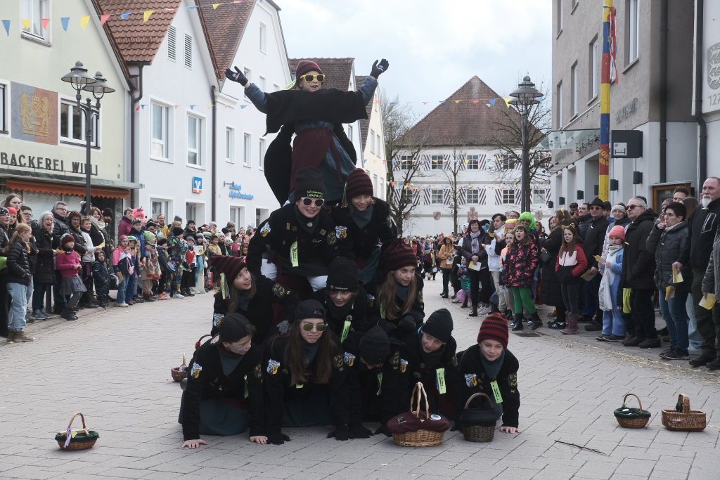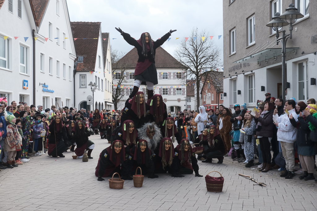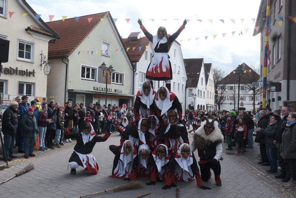 Die 95 Gruppen – davon zwölf Musikgruppen – wurden an den drei Ansager-Positionen in der Markstraße, beim Rathaus und in der Herrenstraße von fachkundigen Zunftmeistern vorgestellt. Und dort zeigten die Hästräger, vor allem natürlich die der Hexengruppen, ihre akrobatischen Fähigkeiten: (Hexen-)Pyramiden und -Karusselle wurden flugs choreographiert, einige davon richtig anspruchsvoll. Und was die Großen können, das können die Kleinen schon lange: Auch der Narrensamen der verschiedenen Zünfte war immer dabei, wenn die zuständigen Narrenmeister das Zeichen dafür gaben.