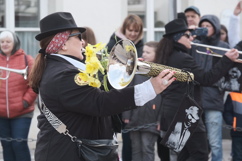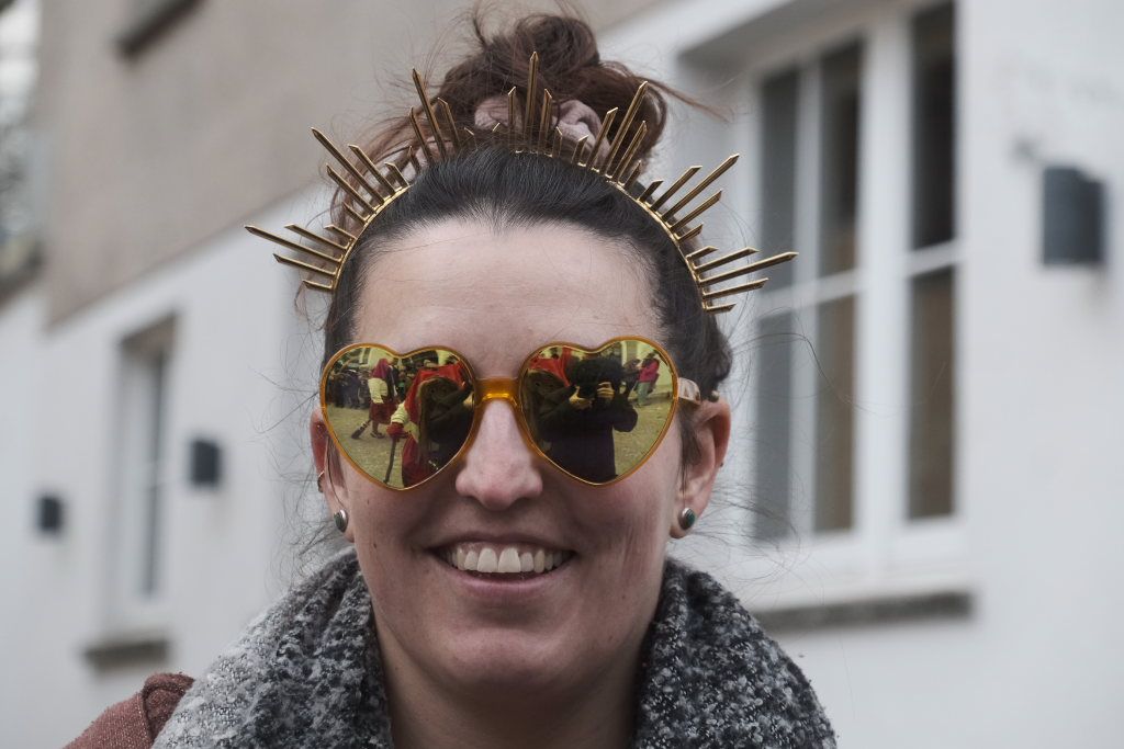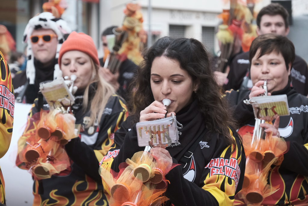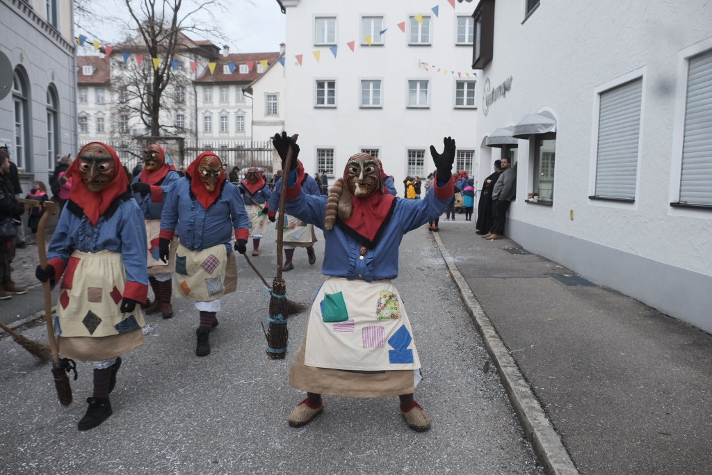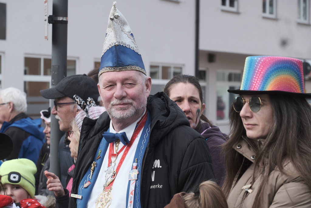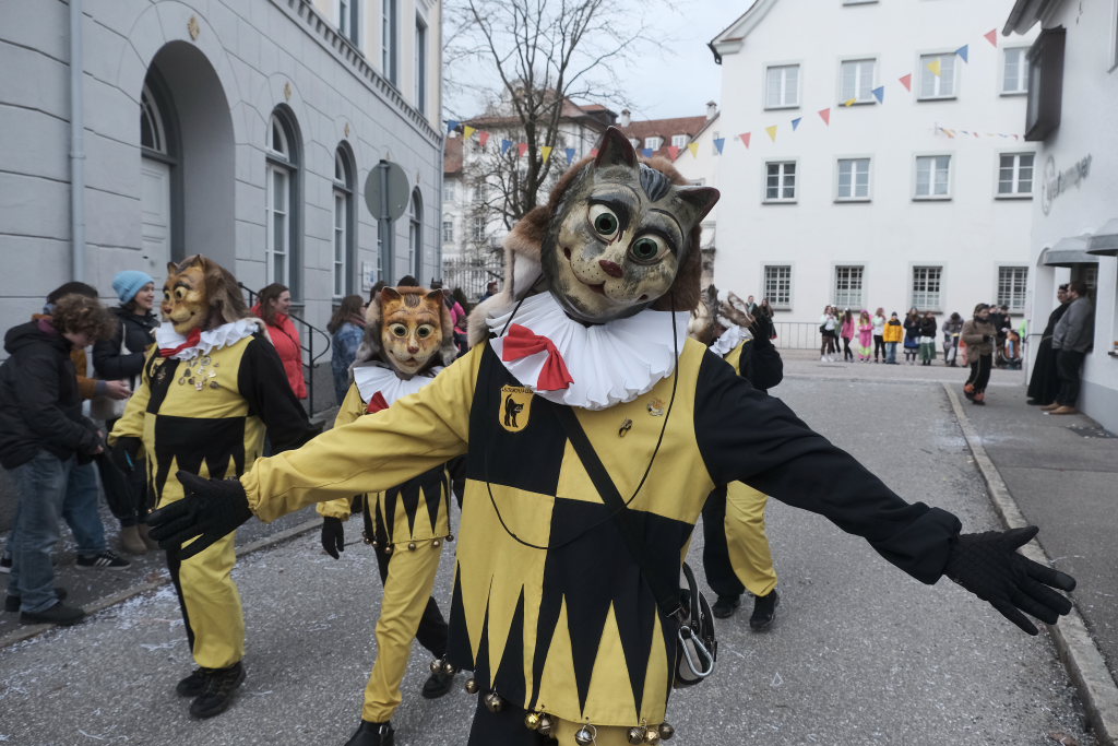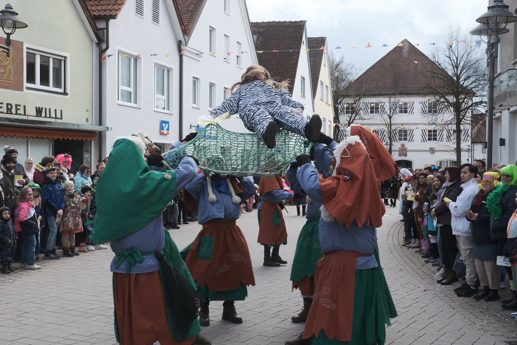 Die 95 Gruppen – davon zwölf Musikgruppen – wurden an den drei Ansager-Positionen in der Markstraße, beim Rathaus und in der Herrenstraße von fachkundigen Zunftmeistern vorgestellt. Und dort zeigten die Hästräger, vor allem natürlich die der Hexengruppen, ihre akrobatischen Fähigkeiten: (Hexen-)Pyramiden und -Karusselle wurden flugs choreographiert, einige davon richtig anspruchsvoll. Und was die Großen können, das können die Kleinen schon lange: Auch der Narrensamen der verschiedenen Zünfte war immer dabei, wenn die zuständigen Narrenmeister das Zeichen dafür gaben.