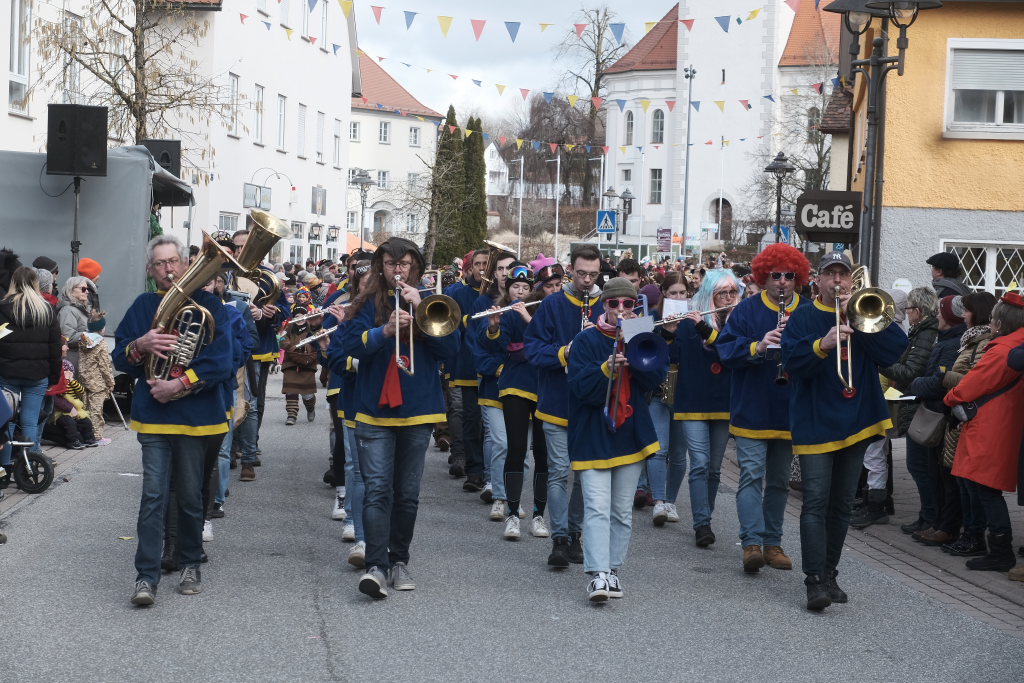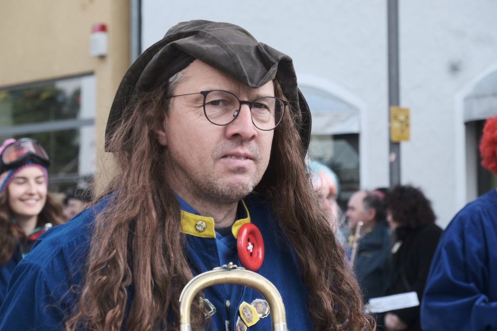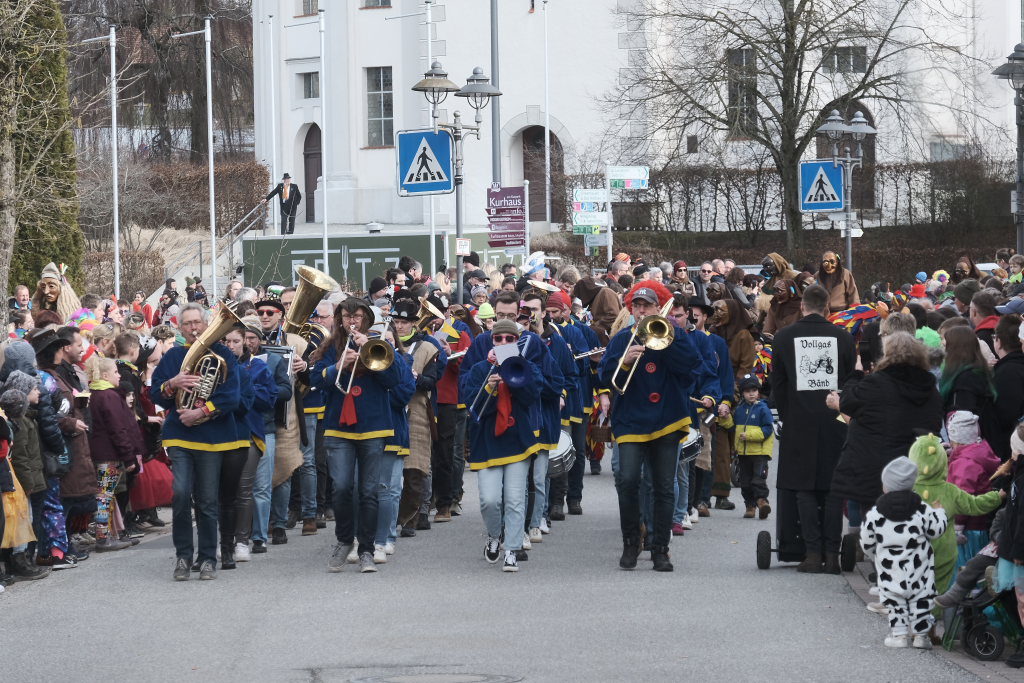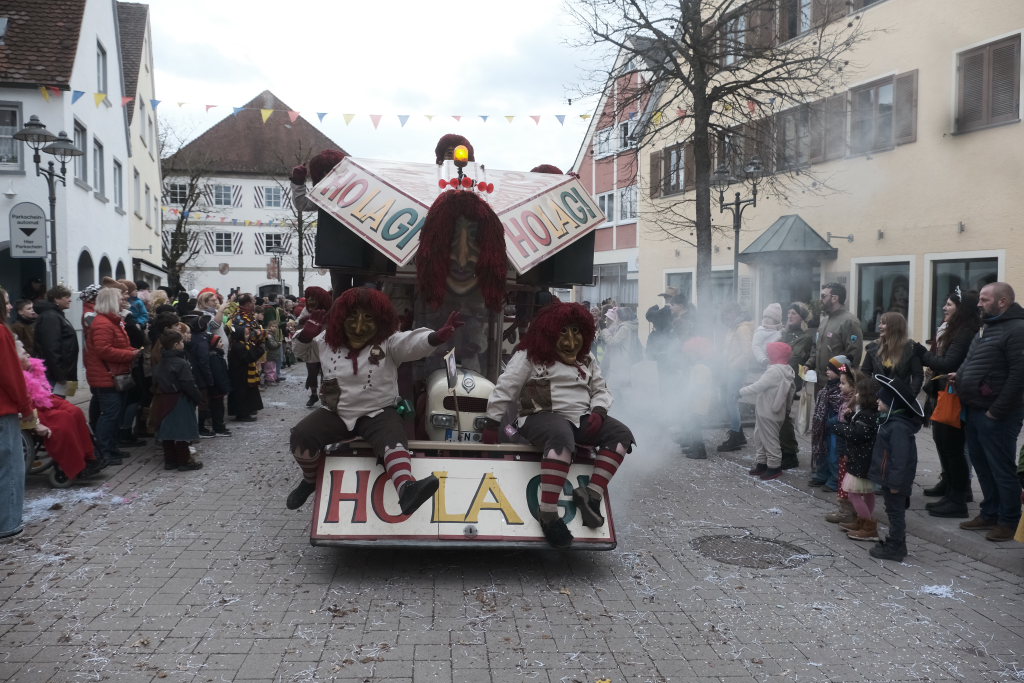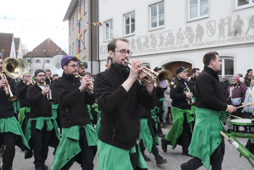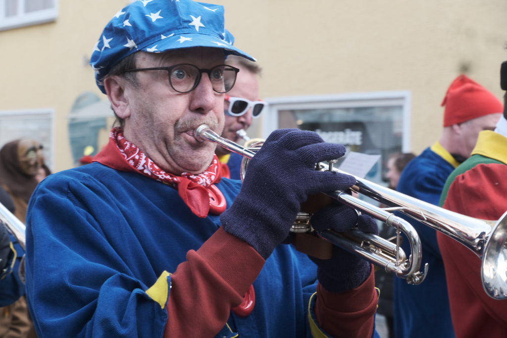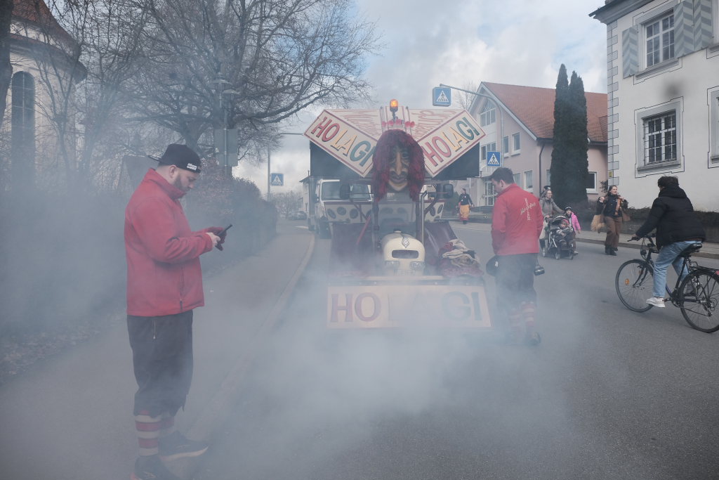 Traditionell eröffnete die Stadtkapelle in ihrem in den Stadtfarben blau, rot und gelb gehaltenen Häs den Narrensprung in Bad Wurzach beim Aufstellungsplatz vor dem Hotel “Rössle”, der kurz vor dem Umzugsstart von Hästrägern nur so wimmelte. Und wo so manche ihre Fahrzeuge schon mal warmlaufen ließen – und dabei ihre Umgebung ganz schön einnebelten.
