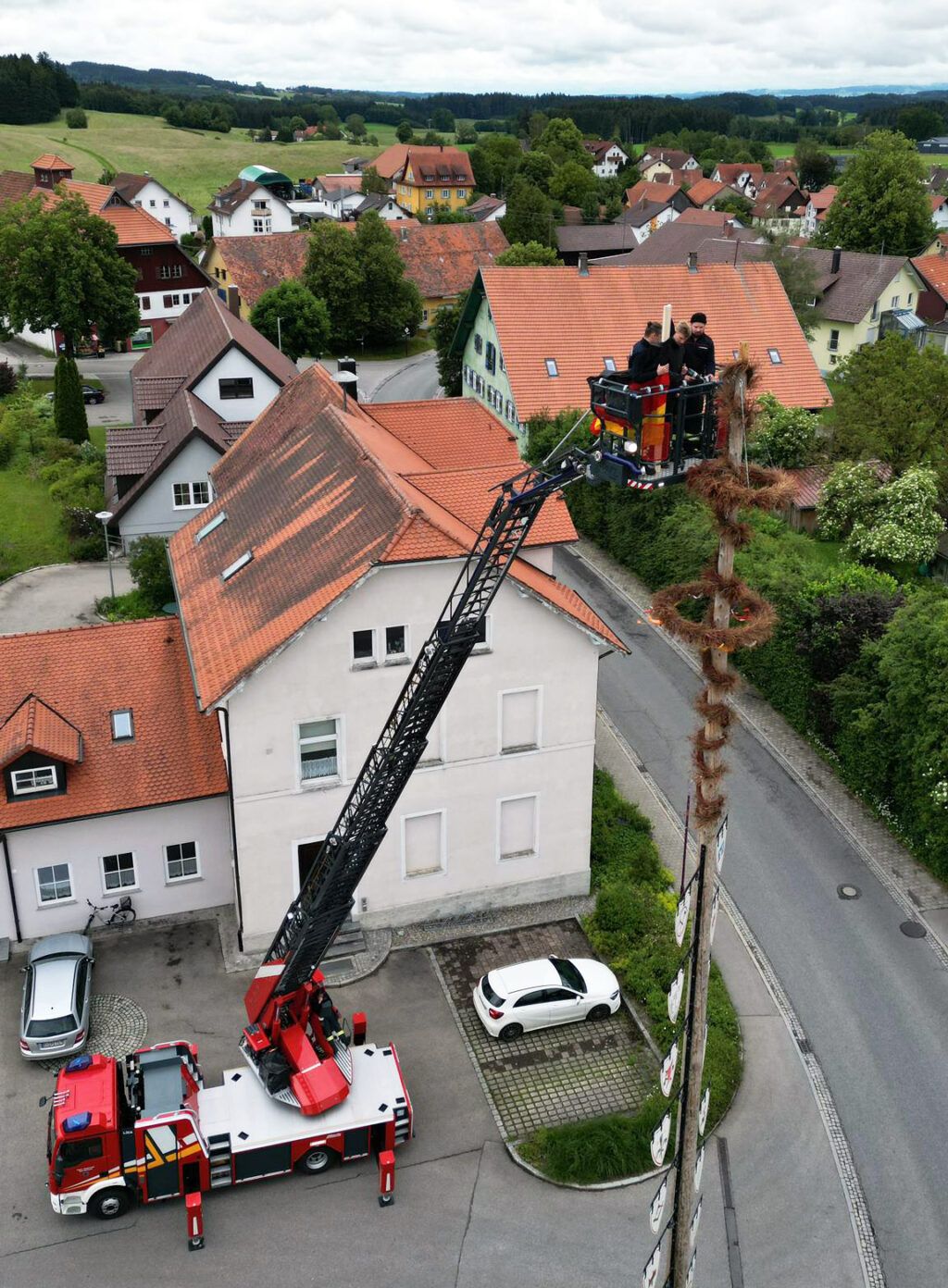 Fahne im Korb: Drei Feuerwehrmänner bringen an der Spitze des Arnacher Maibaums Schwarz-Rot-Gold an.