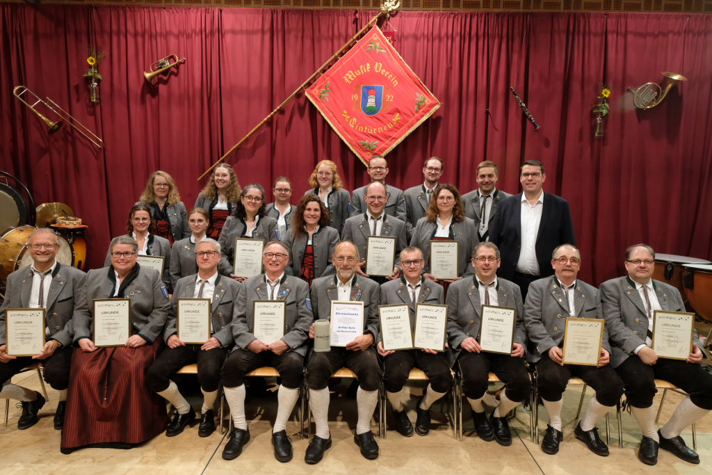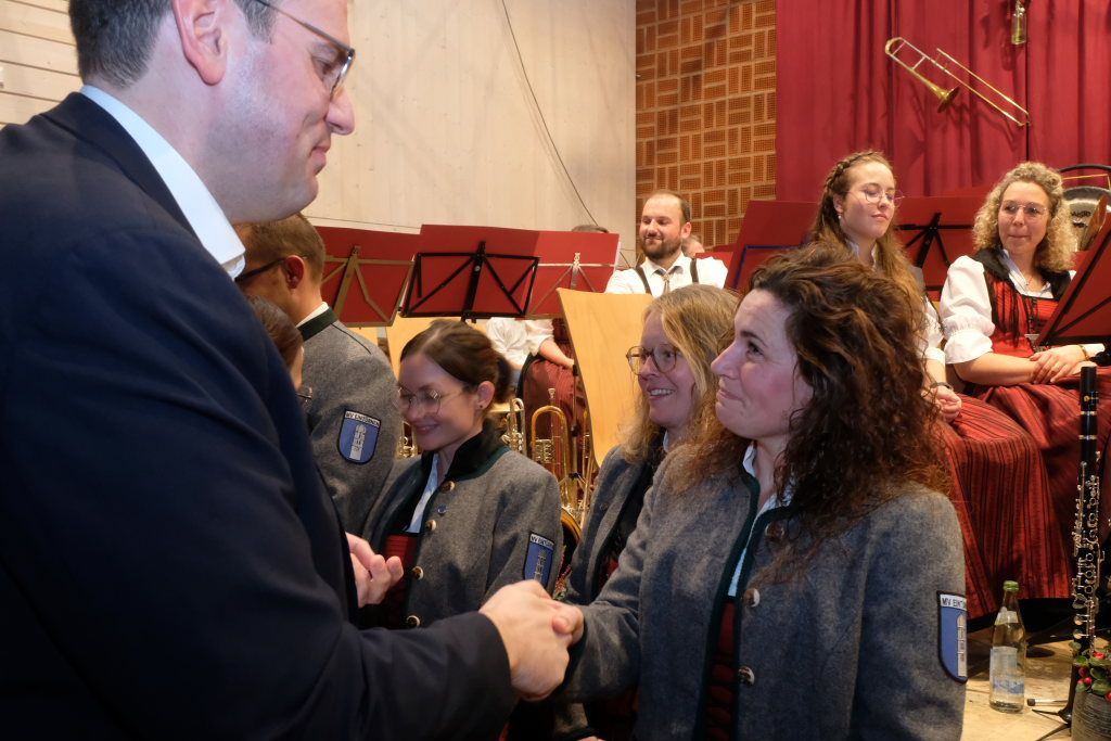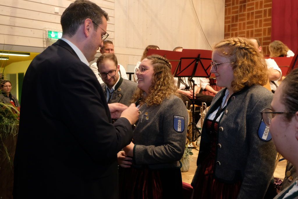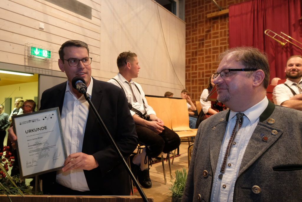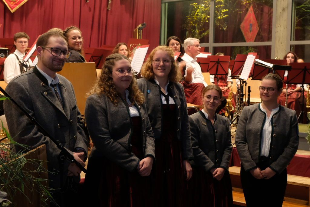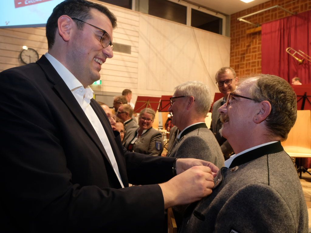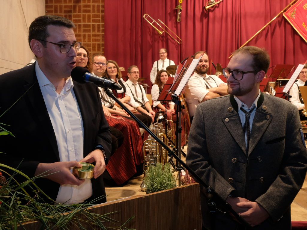 Für 10 Jahre aktives Musizieren wurden mit der bronzenen Ehrennadel des Blasmusikverbands Baden-Württemberg ausgezeichnet: Markus Bendel, der als Tubist eine Dose Leberwurst aus der Klostermetzgerei Reute erhielt. Zusätzlich ist er seit 2023 Vereinskassier.