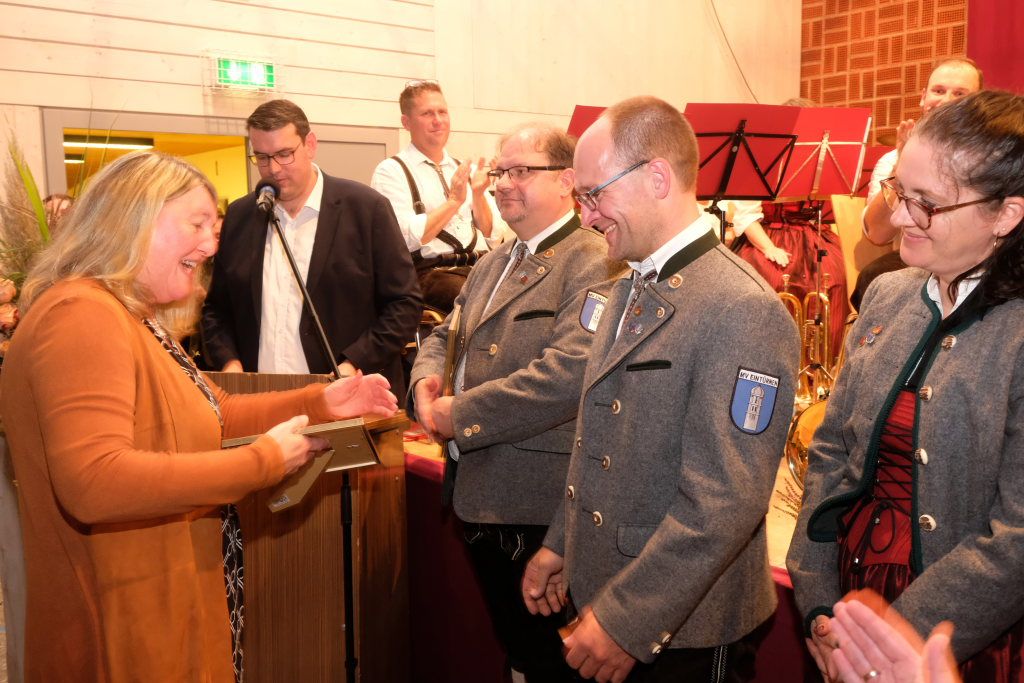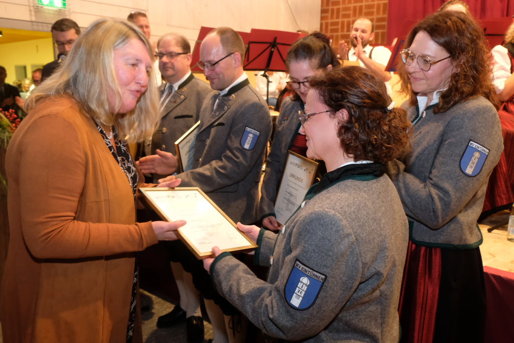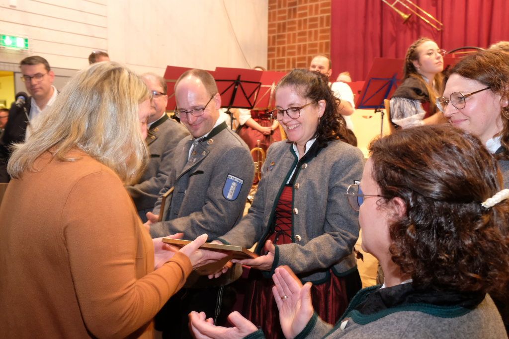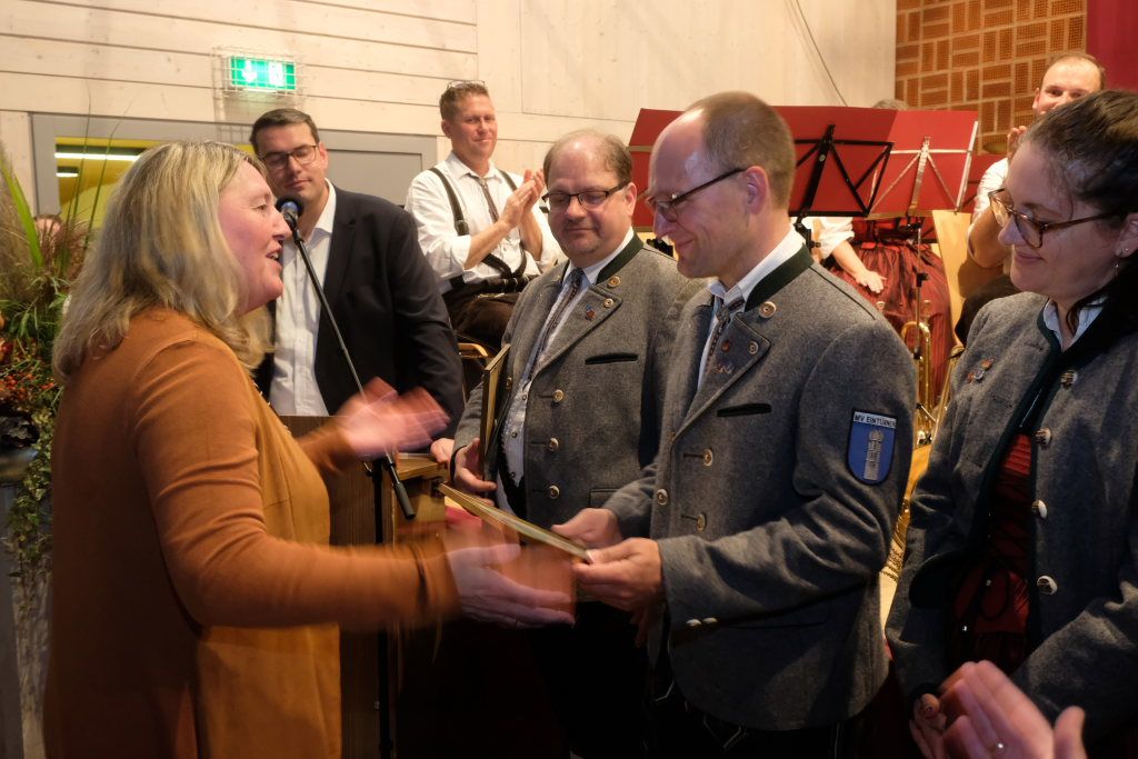 Für 30 Jahre aktives Musizieren wurden goldene Ehrennadeln und Urkunden des Blasmusikverbands Baden-Württemberg überreicht. Für die Urkundenübergabe rekrutierte Wachter niemand Geringeren als die Bad Wurzacher Bürgermeisterin Alexandra Scherer.