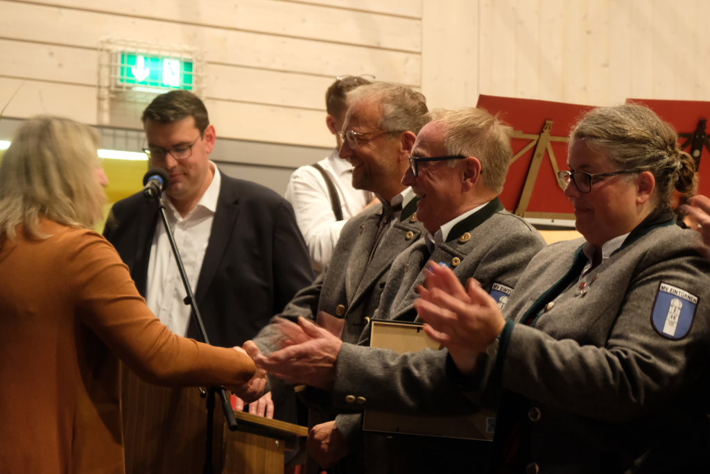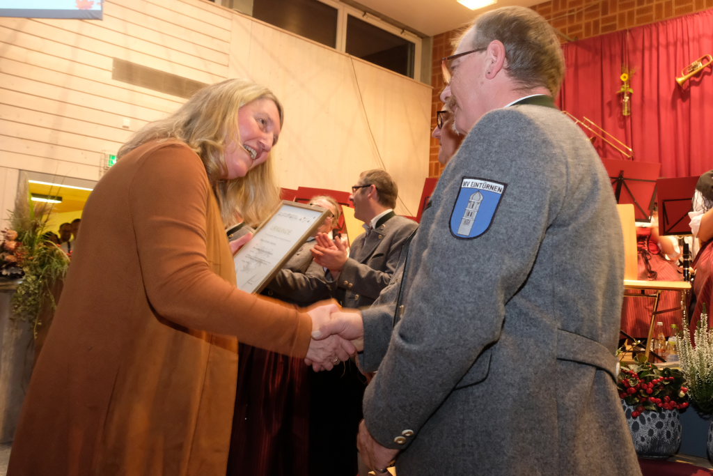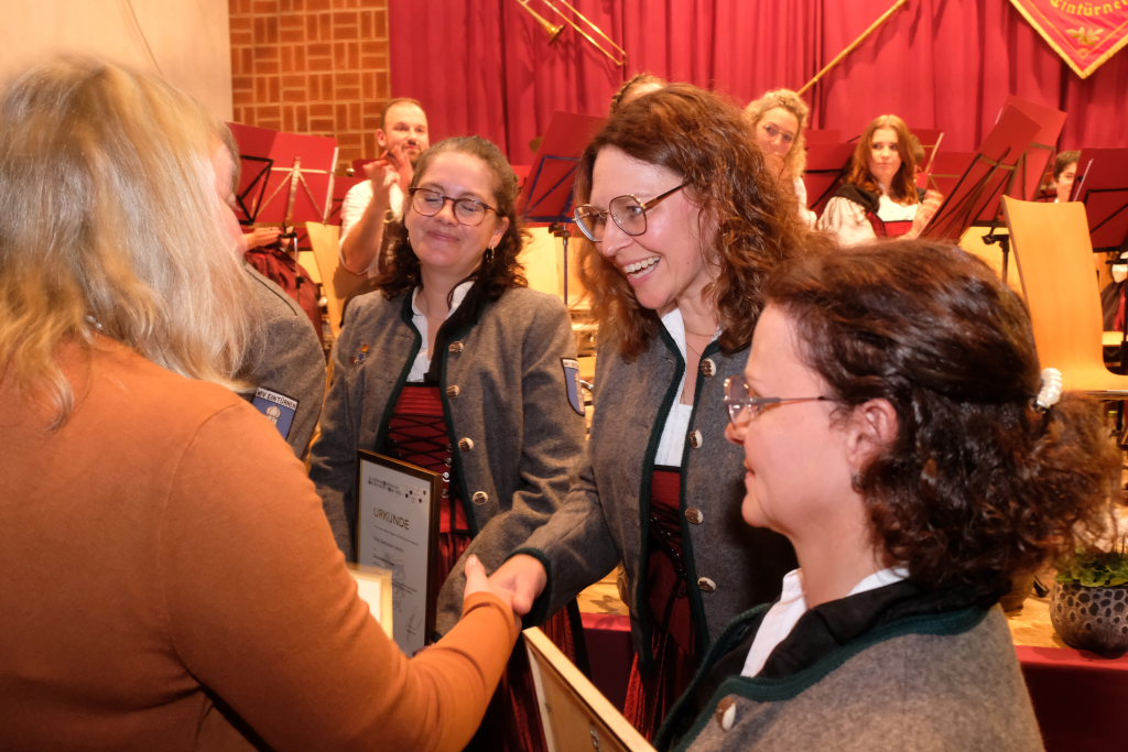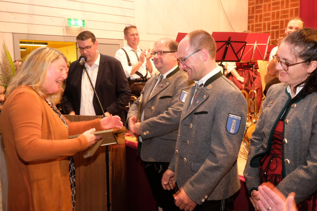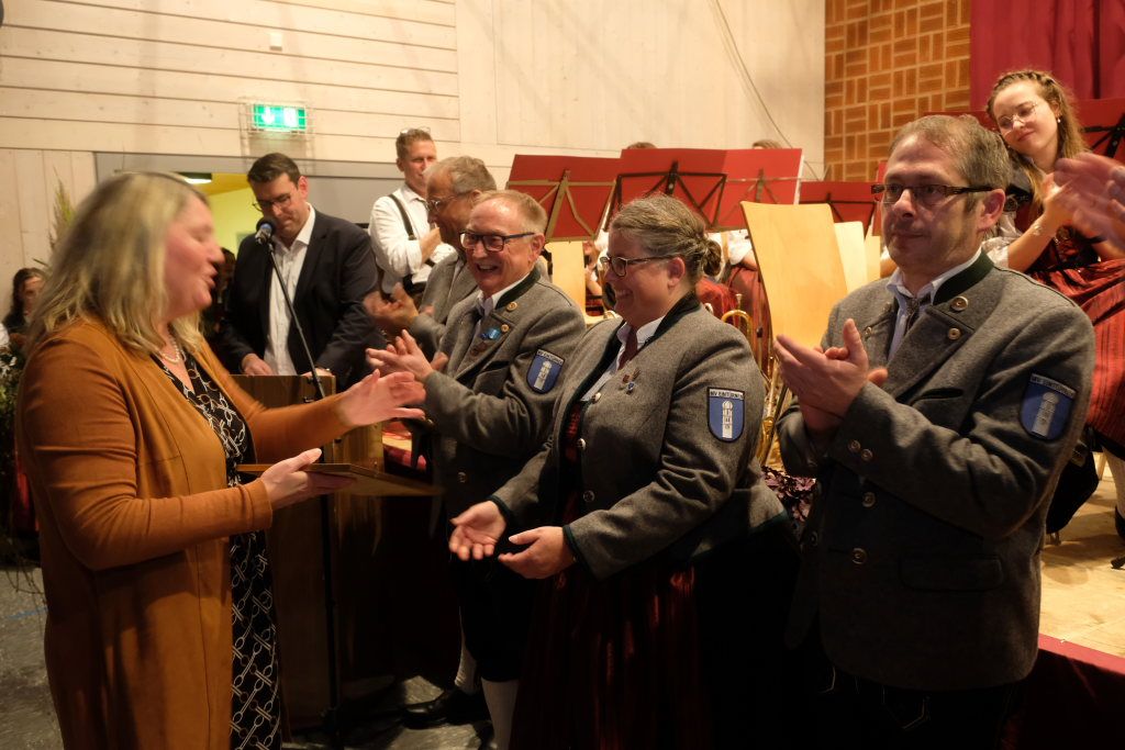 Für 30 Jahre aktives Musizieren wurden goldene Ehrennadeln und Urkunden des Blasmusikverbands Baden-Württemberg überreicht. Für die Urkundenübergabe rekrutierte Wachter niemand Geringeren als die Bad Wurzacher Bürgermeisterin Alexandra Scherer.