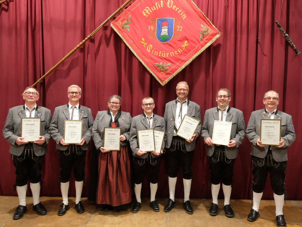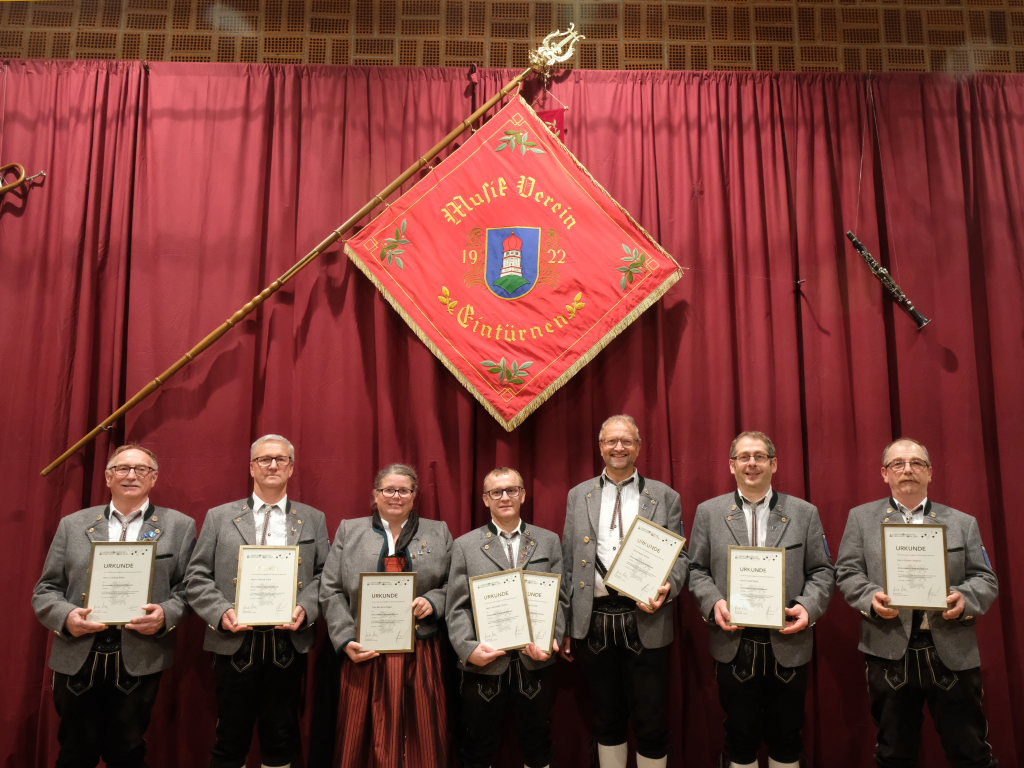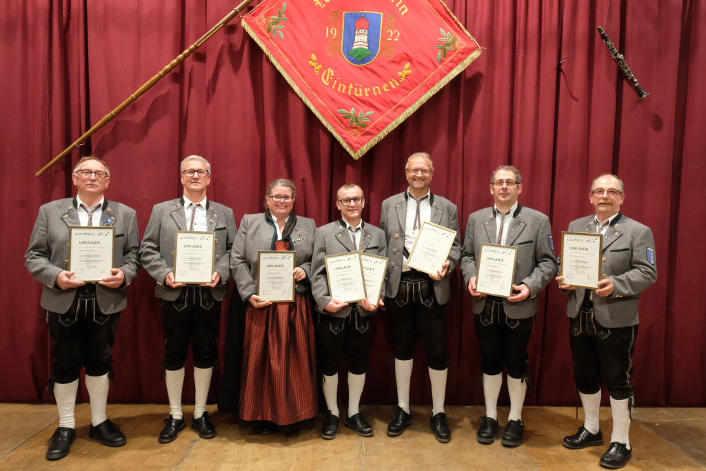 Gruppenbild mit Laudator: Die Geehrten des Musikvereins Eintürnen mit Klaus Wachter vom Blasmusikkreisverband.