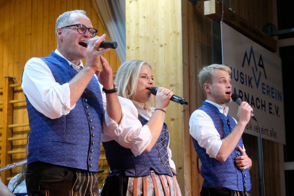 Ins Programm starteten die vielen Musiker des MV Arnach, der in diesem Jahr sein 175-jähriges Bestehen feierte – standesgemäß – mit einem Marsch. Mit einer der neueren Kreationen von Martin Scharnagl (bekannt mit seinem “Vierablech”), der ruhigen Polka “Zeitlos” ging es weiter. Die Finkensteiner Polka war eine Spende von Manfred Miller, genannt Fidele, einem ehemaligen Mitmusiker. „An neuen Ufern“, jener Marsch, der bei der Bewerbung zur “Kapelle des Südens” das Pflichtstück war, ist eines der Lieblingsstücke von Berthold Hiemer, der wieder Dirigent, Sänger und Moderator an diesem Abend in einer Person war.
