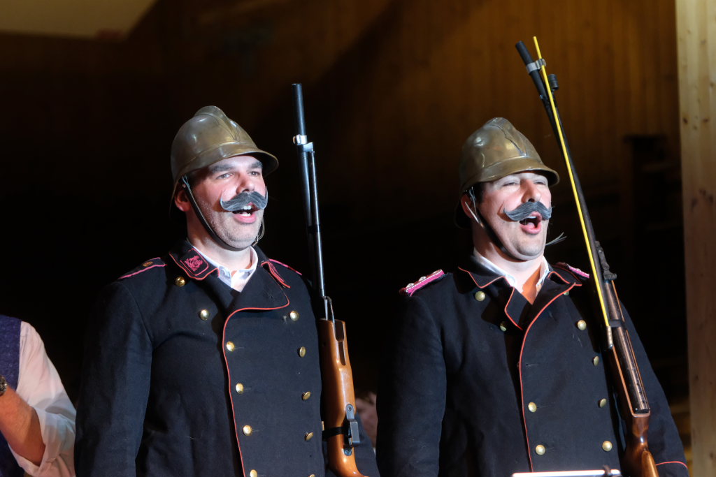 „Hallo kleine Maus“ ist ein Ohrwurm, bei dem Lisa Gottschling alias das MVA Goldkehlchen erstmals zum Mikrophon griff. Seinen ersten großen Show-Auftritt hatte Gebhard „Gebse“ Baumann als Kommandeur zweier tolpatschigen Soldaten beim Deutschmeister-Regimentsmarsch. Weil die Schlagzeuger sonst immer in der hintersten Linie und von den meisten im Publikum gar nicht gesehen werden, hatten sie beim „Lieblingstrommler“ ihren großen Auftritt, dieses Mal aber in der ersten Reihe. Und natürlich durften Julia Hengge, Stefan Braun und Valentin Räth nicht ohne Zugabe für den Marsch Jubelklänge wieder an ihre angestammten Plätze zurückkehren.