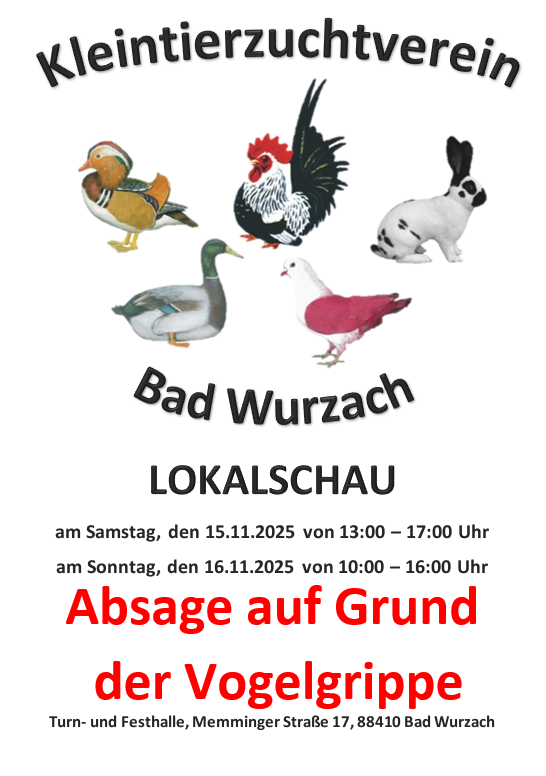 Bad Wurzach – Der Kleintierzuchtverein Bad Wurzach muss dieses Jahr auf Grund der Vogelgrippe seine Ausstellung in der Turn- und Festhalle Bad Wurzach, die für den 15. und 16. November geplant war, absagen.