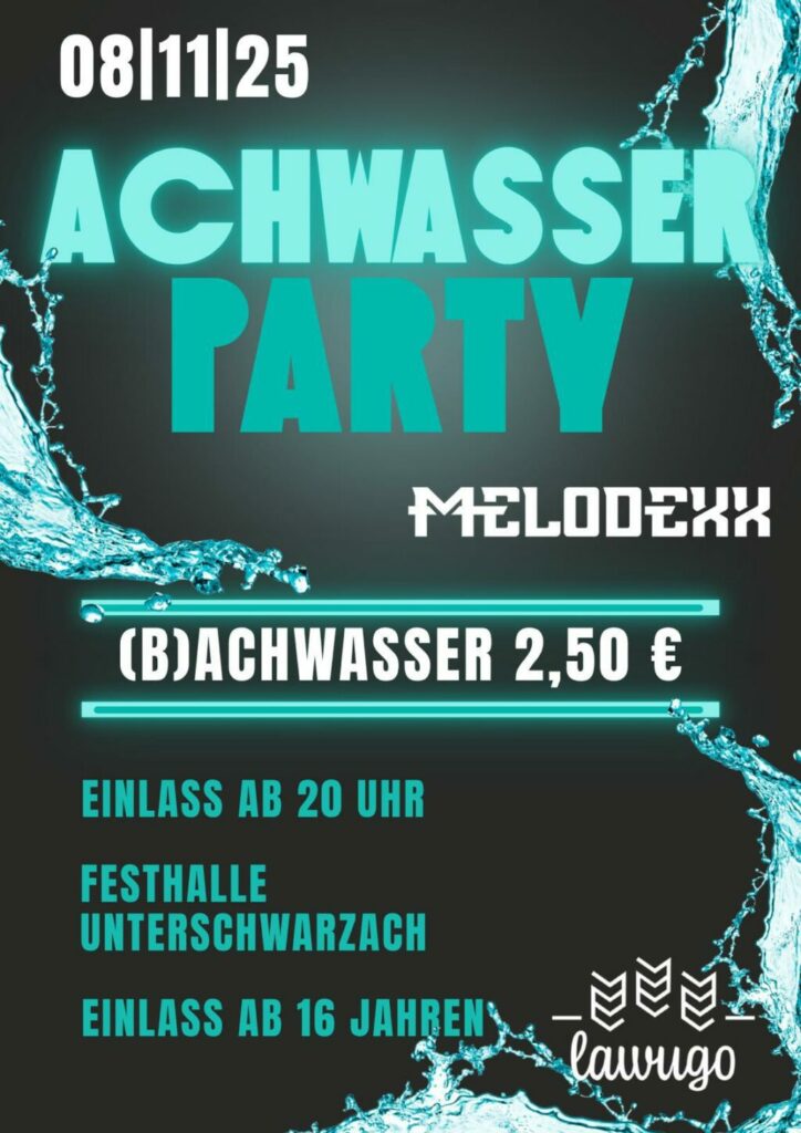 Unterschwarzach – Am Samstag, den 8. November feiern wir mit Euch unsere (B)Achwasser-Party. Los geht es um 20 Uhr in der Turn- und Festhalle in Unterschwarzach. Einlass ab 16 Jahre mit PartyPass. Dabei sorgt DJ Melodexx für eine legendäre Stimmung.