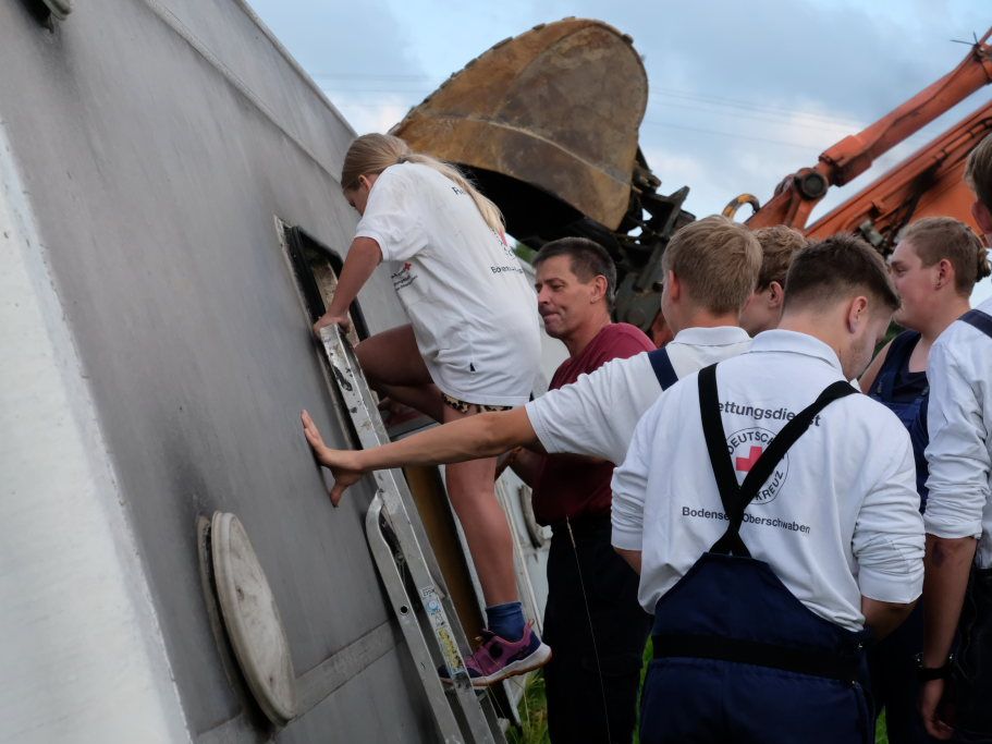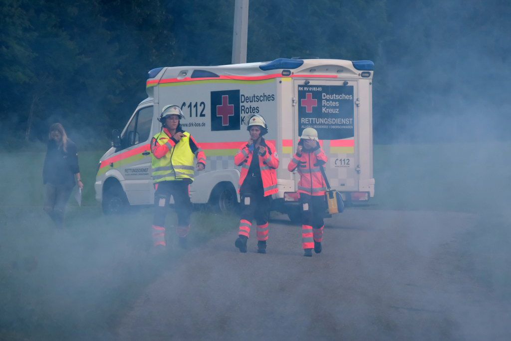 Gemeinsam mit den Rettungsdienstabteilungen des DRK-Ortsverbands Bad Wurzach sowie dem DRK-Kreisverband probte die Feuerwehr Bad Wurzach, Abteilung Stadt, gemeinsam mit der Abteilung Ziegelbach und ihrem brandneuen Fahrzeug den Ernstfall eines Schulbusunglückes mit etwa 15 Verletzten, die aus einem auf die Seite gekippten Bus befreit werden mussten.
